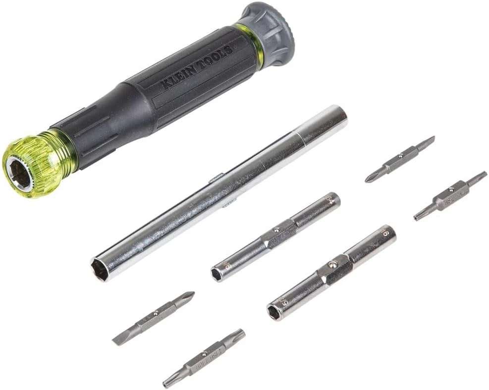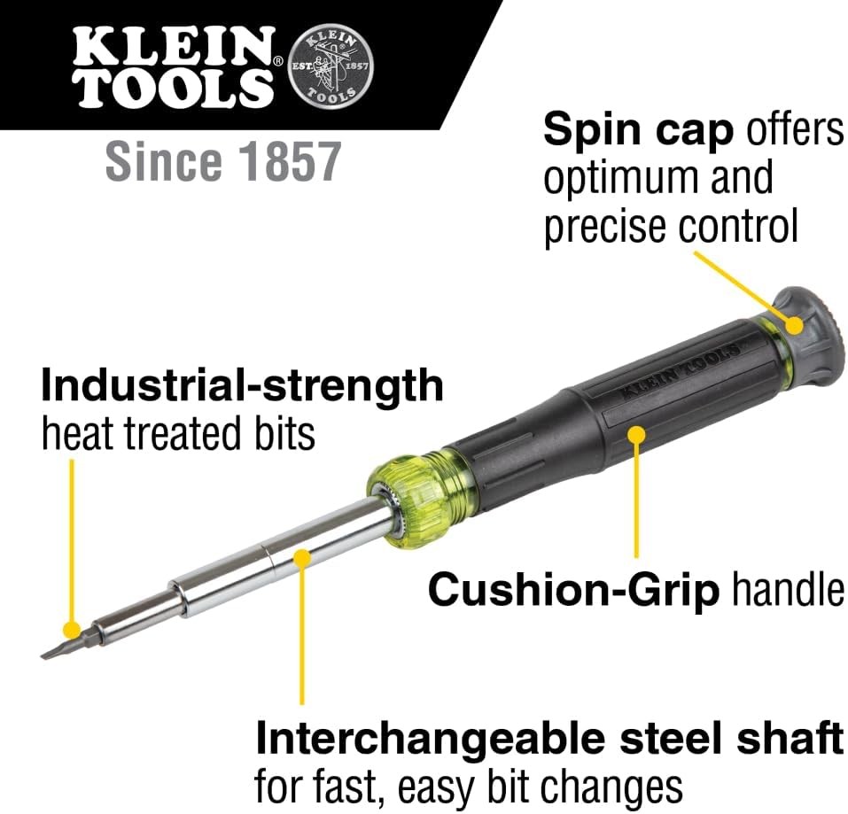 Klein Tools 32314 Electronic Screwdriver, 14-in-1 with 8 Black/Yellow Product Details Brand: Klein Tools Head Style: One-Way Material: Alloy Steel Color: Black/Yellow Recommended Uses For Product: Electronics Item Special Feature: Integrated Precision Nut and Screwdriver; Spin Cap and Cushion-Grip Handle for Great Control Item dimensions L x W x H: 7 x 0.88 x 0.88 inches Item Weight: 2.72 ounces Model Name: 32314 Manufacturer: Klein Tools Part Number: 32314 Product Dimensions: 7 x 0.88 x 0.88 inches Country of Origin: Taiwan Item model number: 32314 Is Discontinued By Manufacturer: No Style: 14-in-1 Electronics Screwdriver/Nut Driver Pattern: Screwdriver Item Package Quantity: 1 Special Features: Integrated Precision Nut and Screwdriver; Spin Cap and Cushion-Grip Handle for Great Control Included Components: Electronic Screwdriver Batteries Included?: No Batteries Required?: No Brand: Klein Tools Head Style: One-Way Material: Alloy Steel Color: Black/Yellow Recommended Uses For Product: Electronics Item VERSATILE 14-IN-1 DRIVER: Precision Screwdriver/Nut Driver combines 14 common precision sizes in one convenient tool PREMIUM SPIN CAP: Free-spinning cap allows your palm to rest in place for optimal control and precise fastening PRECISION-MACHINED BITS: Heat-treated bits provides exact fit to reduce cam-out CUSHION-GRIP HANDLE: Offers greater comfort and torque while fastening EXTENSIVE DRIVING APPLICATIONS: Includes Phillips #00 and #0; Slotted 3/32" and 1/8"; Tamperproof Torx T7H, T8H, T10H, and T15H; Nut driving sizes 9/64", 5/32", 3/16", 7/32", 1/4", and 5/16" EASY BIT SWITCHING: Interchangeable shaft allows for quick and convenient switching of bits to match the task at hand TORX is a registered trademark of Acument Intellectual Properties, LLC Klein Tools 14-in-1 Precision Screwdriver / Nut Driver features 14 of the most common precision sizes in one tool. The Cushion-Grip handle and spin cap provide outstanding comfort and control. This smartly designed tool contains 6 sizes of integrated steel nut driver shafts that securely hold four double-ended screwdriver bits. Carefully heat-treated for industrial strength, the precision-milled bits include multiple sizes of slotted, Phillips and Tamperproof TORX bits. For more than 160 years, Klein Tools has manufactured premium-quality, professional-grade hand tools that deliver the performance, durability and precision needed to get the job done right. Our family of engineers, workers and craftsman continue to put six generations of expertise into every tool we create by using only the highest quality materials, superior workmanship, and keeping manufacturing as close to home as we can. Klein isn't just the name of our company, it's also our family name. And since we're an American company that's family-owned and family-run, you know you can count on us to be here tomorrow. Klein Tools doesn't just make great products, we make great products that stand up to the demands of the professionals who use them every day ... Since 1857.