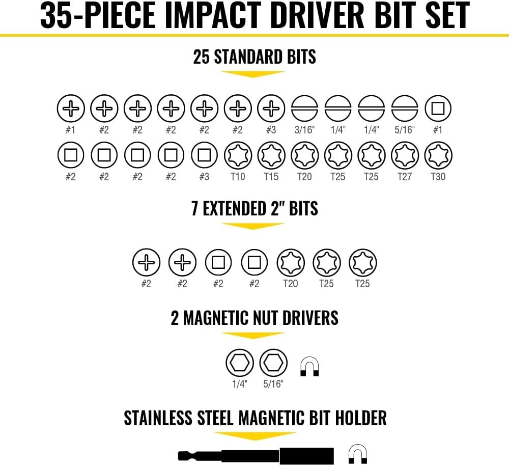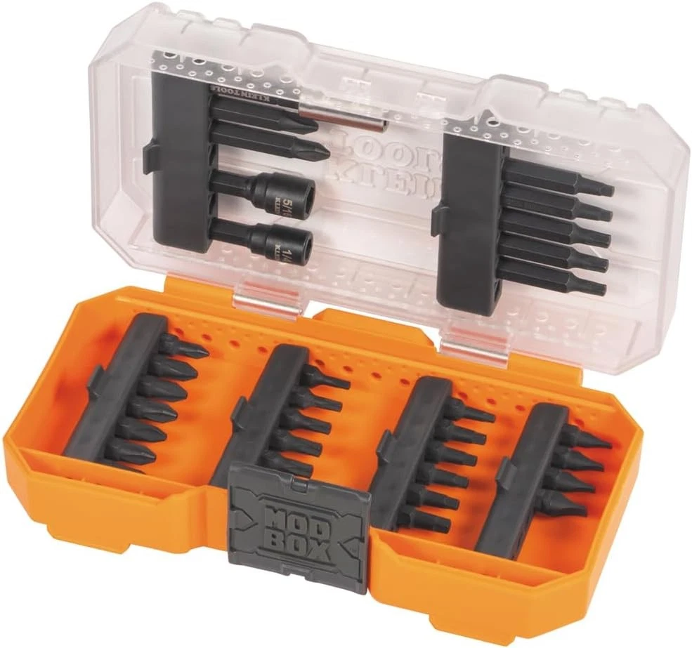Klein Tools 33800 Impact Driver Bit Set, 35-Piece, S2 Steel with Orange Product Details Brand: Klein Tools Item Length: 7 Inches Material: Stainless Steel Number of Pieces: 35 Manufacturer: Klein Tools Part Number: 33800 Item Weight: 1 pounds Country of Origin: Vietnam Item model number: 33800 Color: Orange Style: 35-Piece Item Package Quantity: 1 Head Style: Phillips Special Features: Ergonomic Batteries Required?: No Brand: Klein Tools Item Length: 7 Inches Material: Stainless Steel Number of Pieces: 35 IMPACT-RATED: Steel impact driver bits are S2 impact-rated and built for heavy-duty applications EXTENDED REACH: Easily access hard to reach fasteners with the #2 Phillips and #2 square bits STORAGE CASE: Included case is compact, can stack to cases with similar designs and is compatible with Klein's MODbox MAGNETIC BIT EXTENSION: Strong magnet on the 3-Inch bit extension helps keep bits in place 35-PIECE BIT SET: Includes a variety of Phillips, slotted, square and TORX bits MAGNETIC NUT DRIVERS: 1/4-Inch and 5/16-Inch magnetic power nut drivers facilitates work on bolt applications HEX POCKETS: Minimal chamfering enhances surface contact between the nut and driver for improved grip and stability PRECISION-MILLED BIT TIPS: Provide a secure fit and reduce wear on fasteners Klein Tools designed a set of impact driver bits for the professional tradesman and do-it-yourself enthusiasts. All of the bits are made of high-impact rated S2 steel. The 3-Inch bit holder and 1/4-Inch and 5/16-Inch nut drivers have strong magnets to easily hold bits and fasteners in place. Minimal chamfering on the nut driver hex pockets increases surface contact between the nut and driver for better performance. All 35 pieces fit in a durable, impact-resistant case featuring steel hinges, a stay-shut latch and modular stackability with other cases of similar design.