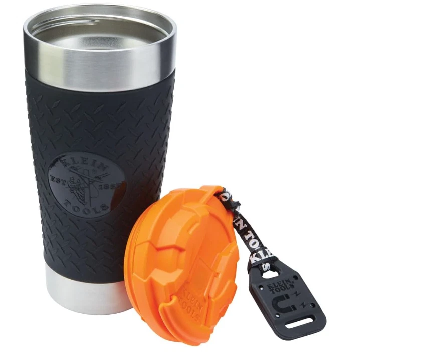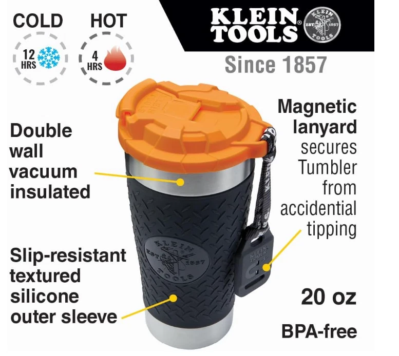 Klein Tools 55580 Stainless Steel Tumbler, 20 Oz. Insulated Vacuum Mug with Flip-Top Lid Tumbler uses double wall vacuum insulated stainless steel to keep liquid cold up to 12 hours and hot up to 4 hours Unique double-thread lid design allows easy twisting with gloves on or off Flip-top lid locks to form a spill-resistant seal for transport Textured silicone outer sleeve enables a slip-resistant grip with gloved or ungloved hands Slip-resistant bottom pad friction-grips to most surfaces Removable Rare-Earth magnetic lanyard helps secure tumbler to metal objects Made from stainless steel and other BPA-free food grade materials When you receive your order and have any queries or concerns about the product, feel free to message us. We guarantee 100% resolution for you. Our commitment is to provide high-quality products and exceptional customer service, ensuring your trust and satisfaction.