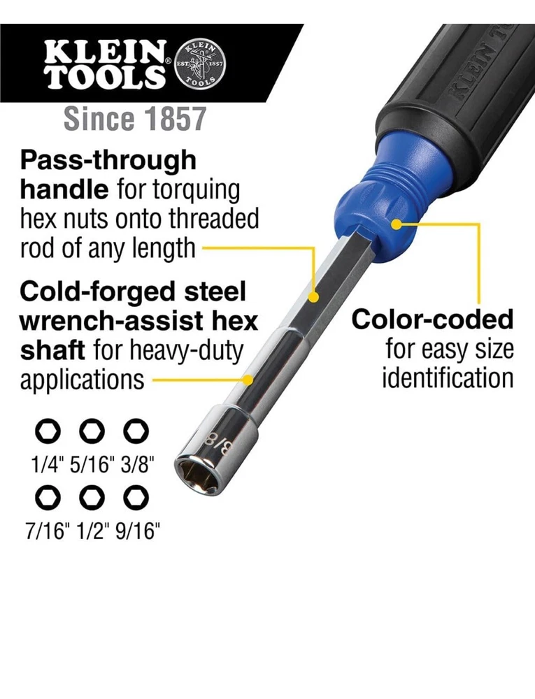 Klein Tools 65411 Hollow-Shaft Nut Driver Set, Heavy-Duty, Color-Coded Hex Sizes 1/4 to 9/16-Inch, Cushion-Grip Handles, 6-Piece