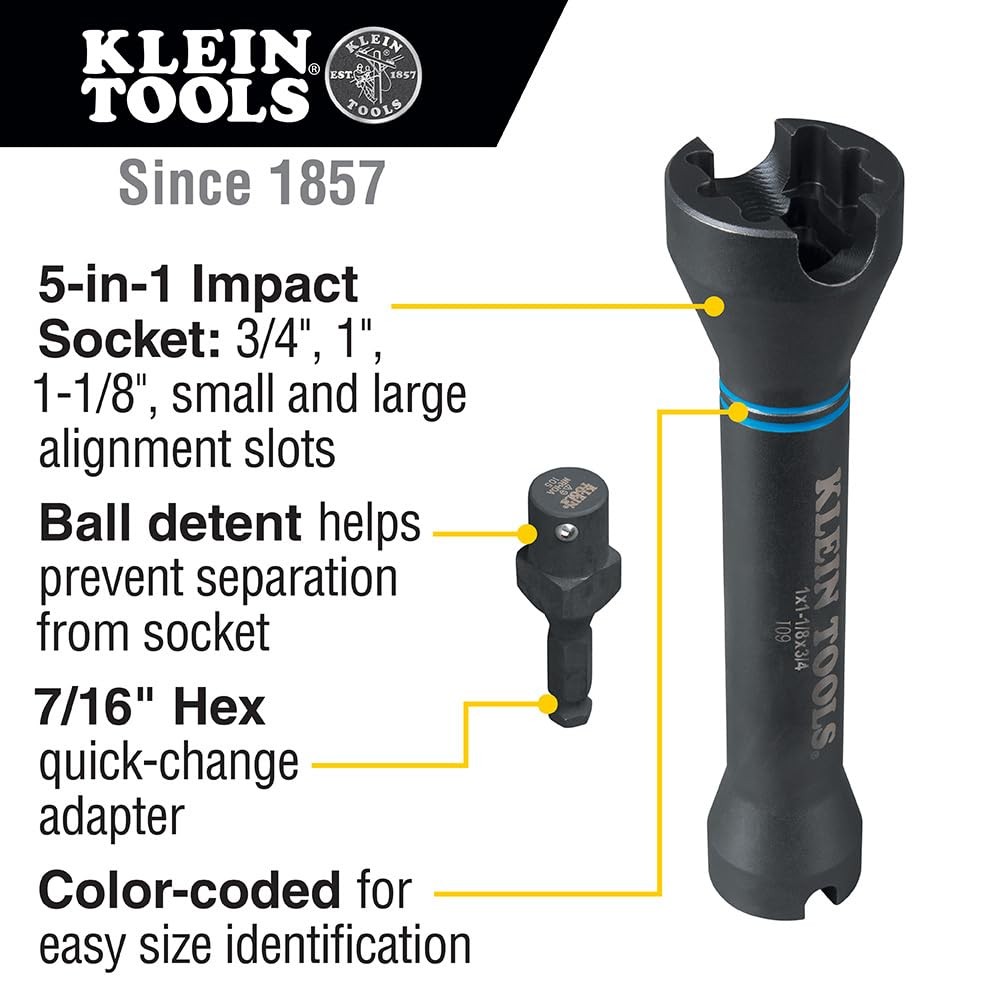 Klein Tools NRHD 5-In-1 Impact Socket, Features Three Square Socket Sizes: 3/4-,1, and 1-1/8- Inch, and Small and Large Alignment Slots Product Details Brand: Klein Tools Item Length: 7.75 Inches Material: Alloy Steel Drive System: Square Finish Type: Painted Number of Pieces: 1 Manufacturer: Klein Tools Item Weight: 1.51 pounds Country of Origin: China Item model number: NRHD Is Discontinued By Manufacturer: No Is Discontinued By Manufacturer : No Product Dimensions : 7.75 x 2 x 3 inches; 1.51 Pounds Item model number : NRHD Manufacturer : Klein Tools Country of Origin : China Brand: Klein Tools Item Length: 7.75 Inches Material: Alloy Steel Drive System: Square Finish Type: Painted The Klein Tools versatile 3-in-1 Impact Socket reigns as the market leader for Linemen and Utility Workers. It features three popular square sizes that can be quickly and easily converted for a variety of utility type applications. Designed with an alignment slot to tighten and loosen most pole hardware. It also has a long, hollow shaft designed to fit over long threaded bolts. For more than 160 years, Klein Tools has manufactured premium-quality, professional-grade hand tools that deliver the performance, durability and precision needed to get the job done right. Our family of engineers, workers and craftsman continue to put six generations of expertise into every tool we create by using only the highest quality materials, superior workmanship, and keeping manufacturing as close to home as we can. Klein isn't just the name of our company, it's also our family name. And since we're an American company that's family-owned and family-run, you know you can count on us to be here tomorrow. Klein Tools doesn't just make great products, we make great products that stand up to the demands of the professionals who use them every day ... Since 1857.
