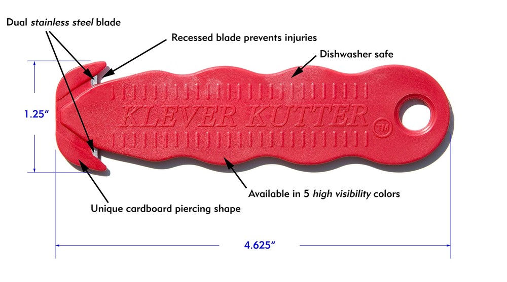 Safety cutter easily opens heavy durable packages in a moment, and protect the finger from sharps. Klever Cutter Package Openers include 5 utility knives in a pack All colors included as on the photo Easy To Use: Perfectly Opens Durable Seal. One Hand Divide Small Box Easier Than Knife. Carton Cutter Is Used In Home, Office And Garage. Blade Cutter Is Curve Inside The Shape, That Make It Easy For Light And Box Cutter Heavy Duty Safety: Designed To Keep Your Fingers 100% Safe From Sharp. Box Cutter Blades Hidden Inside The Box Opener. Material Is Strong And Longlasting. Cutterknife Cuts Small Boxes. Package Cutter Simplifies Storaging Than Other Box Cutter Tool Package Includes 5 Cutters, Perfect Stocking Stuffer For Your Neighbors. Use Klever Knife In Every Season All Year Long. Cutter Knifes Pack Is Good For You And Your Friends. Mini Box Cutter Is Durable, So You Packed For A Long Time Helps To Cut Fast A Box Or Cable For Recycling. Mini Box Cutter Are Made From Stainless Steel, So Perfect For Every Box Openers. Cut Cardboards In Line Momently, Then Utilize. Safety Cutting For Adults. Klever Knifes Are Colorful To The Eye, Easy To Hands