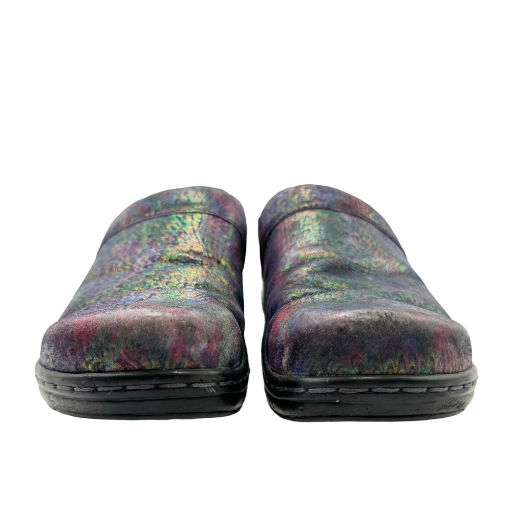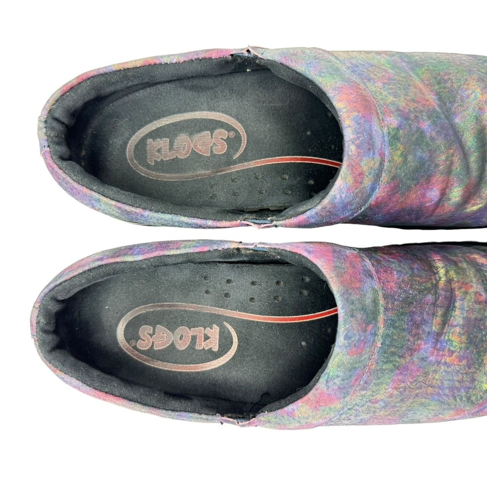 Klogs Mission Pyramid Women's Leather Work Clogs - Women's size 7.5M - Rainbow multi color in a shiny iridescent foil finish - Padded collar - Flexible strobel construction - Shock absorbent midsole - Elastic gore - Removable footbed - Polyurethane Outsole - MARK II ASTM F1677 tested slip-resistant outsole - Non-marking outsole - Anti-microbial microfiber lining - Printed leather upper - Accommodates orthotics - Generous toe box - Impact absorbing arch support and heel cup - 1" low wedge heel Size: Womens 7.5 Condition: Pre-Owned Shoes are in very good preowned condition with no flaws.