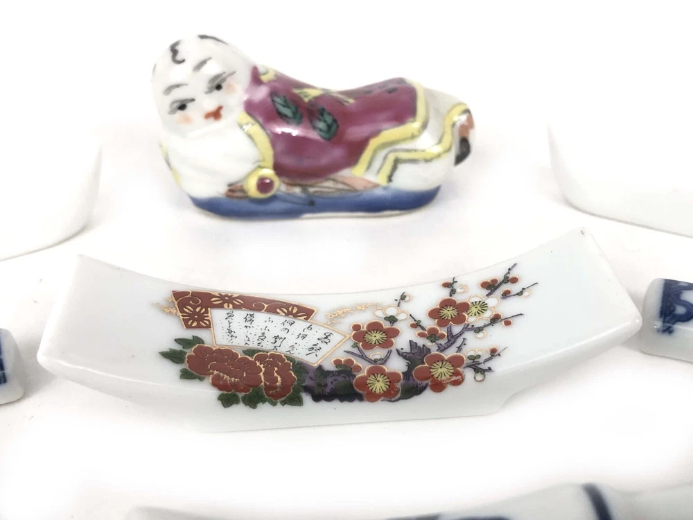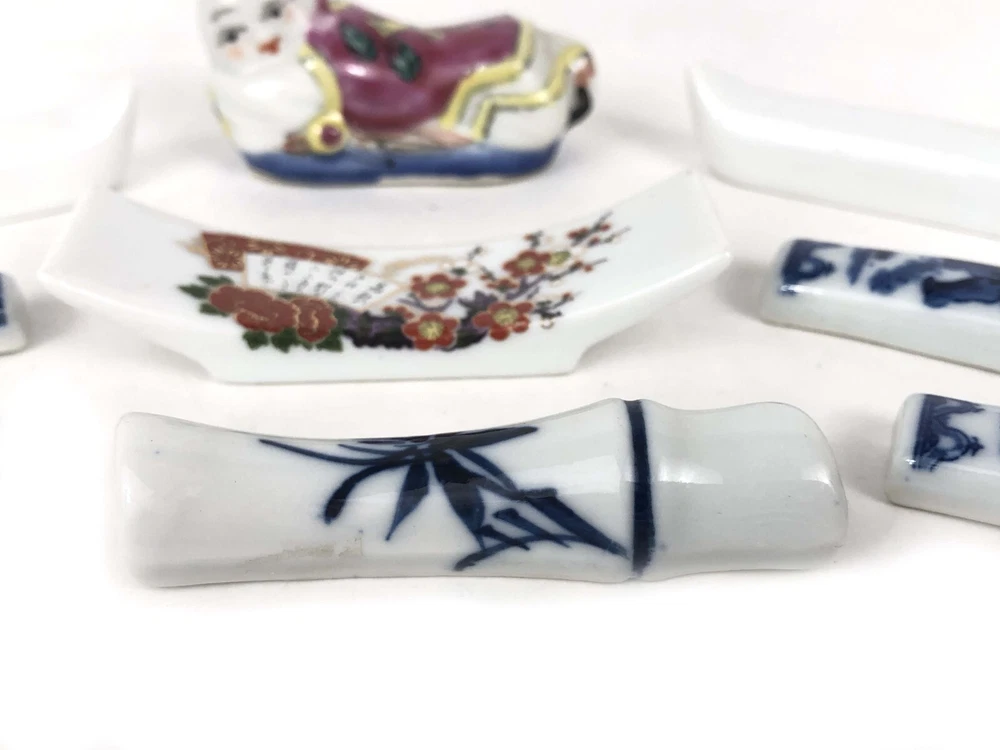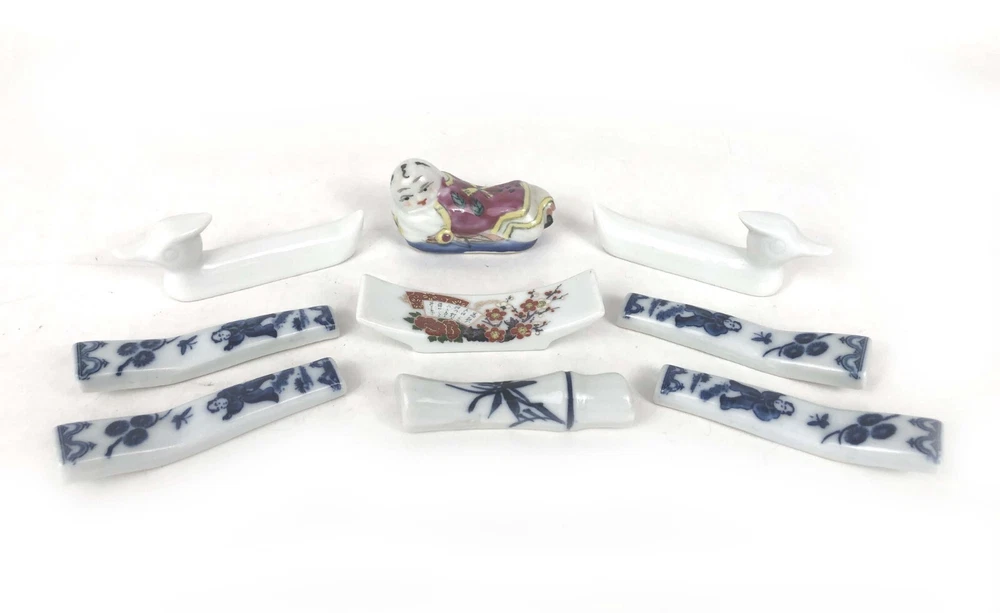 This set of 9 knife rests features an Asian theme with porcelain and china in the shape of children, ducks, fans, and bamboo. Each knife rest is uniquely crafted and perfect for adding a touch of elegance to your dinner table. The origins of these knife rests are unknown, adding to their intrigue and charm. Whether you are a collector of unique dining accessories or simply want to impress your guests, these knife rests are sure to be a conversation starter. They are versatile enough to be used for other types of utensils, such as chopsticks or spoons. This set falls under the categories of Other Dinnerware & Serveware, Dinnerware & Serveware, Kitchen & Home, and Collectibles. If you are looking for a unique and elegant addition to your dining collection, these knife rests are the perfect choice.