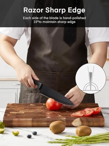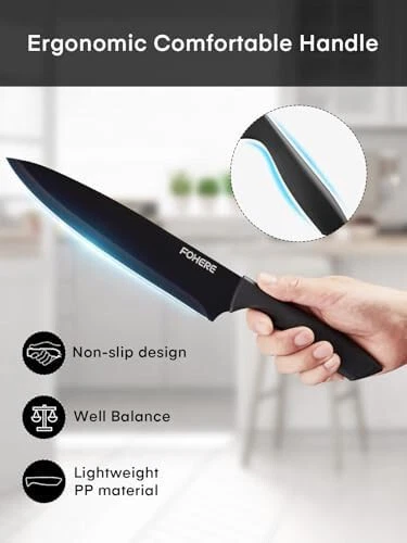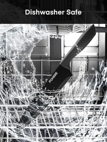 Knife Set, 13-Piece Kitchen Knife Set with Block Wooden German Stainless Steel Description:- 13-piece Knife Set Includes: 8" chef's knife, 8" slicing knife, 8" serrated bread knife, 5" utility knife, 3.5" paring knife, 6 *4.5" serrated steak knives, 1 kitchen shear, PP knife block with built-in knife sharpener Exclusive Integrated Sharpener: With a sharpener, cutting, chopping, dicing or slicing will be fast and smooth with the durable and perfectly sharp kitchen knives. You don't even need to worry about where to find a separate sharpener stone Professional Anti-Rust Black Coating: Our BO Oxide technology prevents the steel from oxidizing, ensuring years of anti-rust performance. And will not cause damage despite the high intensity impact of the dishwasher Anti-slip and Soft Handle: The black frosted textured PP handle ensures a comfortable experience and won't slip when your hand gets wet. No fatigue even after long hours of cooking Easy to Clean: The holes of bottom of knife block makes it easy to drain after cleaning and keep your cabinets clean. This kitchen knife set is perfect for professional and amateur chefs.