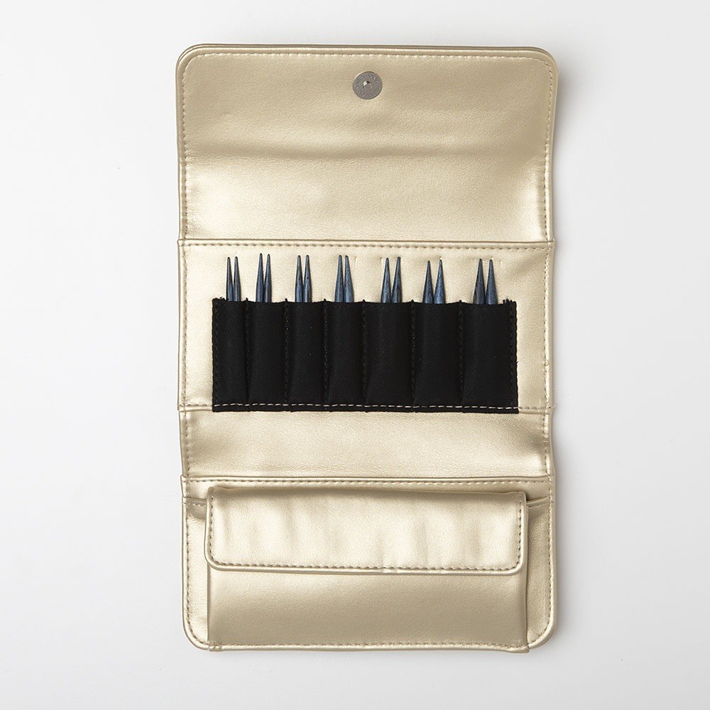 Limited Edition! Our Knit Picks Options™ Interchangeable knitting needles are crafted for knitters who demand versatility, comfort, and precision. Made from durable and lightweight materials, these needles are known for their smooth, snag-free joins, making transitioning between cables and tips effortless. Whether you’re knitting a cozy sweater or intricate lace, the tapered tips allow for easy stitch manipulation and quick progress. Customers rave about the high-quality feel of the needles, highlighting the comfort during long knitting sessions and the flexibility offered by the interchangeable system. The cables are flexible yet sturdy, and the needles glide through yarn without splitting. Perfect for both beginner and advanced knitters alike, these needles combine the joy of knitting with lasting durability and performance. Material: Laminated Birch Wood Needle Tip Length: 2.75" (7cm) Set Includes: Blue & Gold Short Interchangeable Tips US Sizes: 4, 5, 6, 7, 8, 9,and 10 (3.50mm, 3.75mm, 4.00mm, 4.50mm, 5.00mm, 5.50mm, and 6.00mm) Black Nylon Cables 2x 16" lengths* Accessories Small gold vegan leather clutch, 30 locking metallic stitch markers, 4 black end caps, 2 cable keys, and cable connectors * Sizing of the interchangeable cables refers to the total length achieved when the needle tips are attached to the cables.