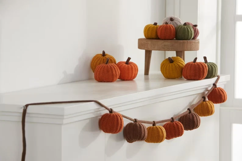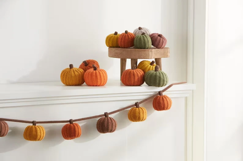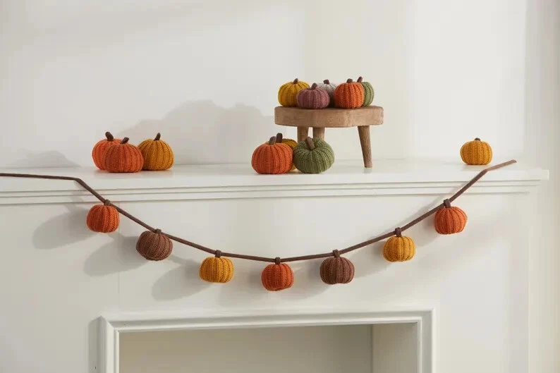 Knit pumpkin 6' garland, with 7 pumpkins, fall decor, bookshelf accent, warm coz