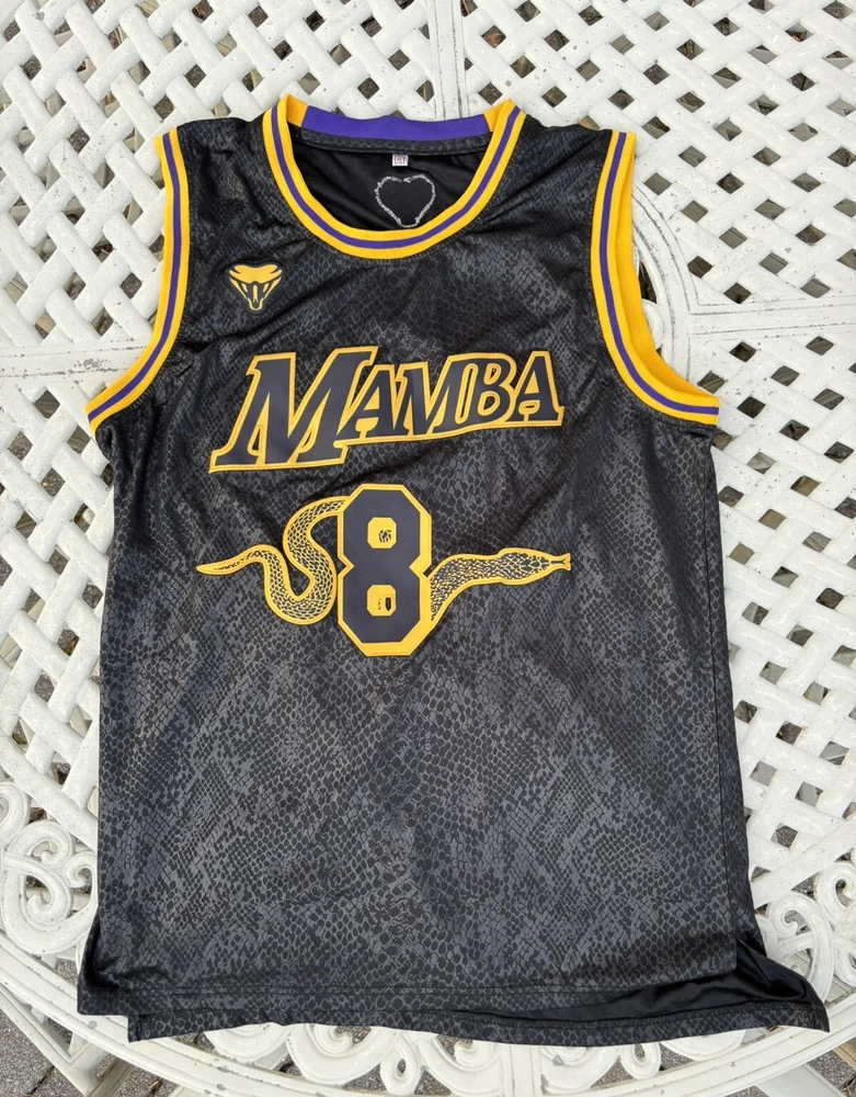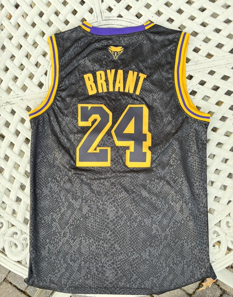 Show your love for the Los Angeles Lakers and the late Kobe Bryant with this replica Mamba jersey. The black and gold color combination with purple trim perfectly pays homage to the iconic player. Made for basketball fans, this size M jersey is perfect for those who want to represent their favorite team and player. The jersey features the number 24, Bryant's signature number, on the back and has the Lakers logo on the front. This product is a must-have for any fan of the NBA and the Lakers.