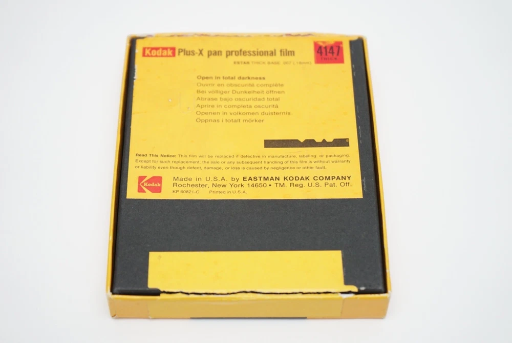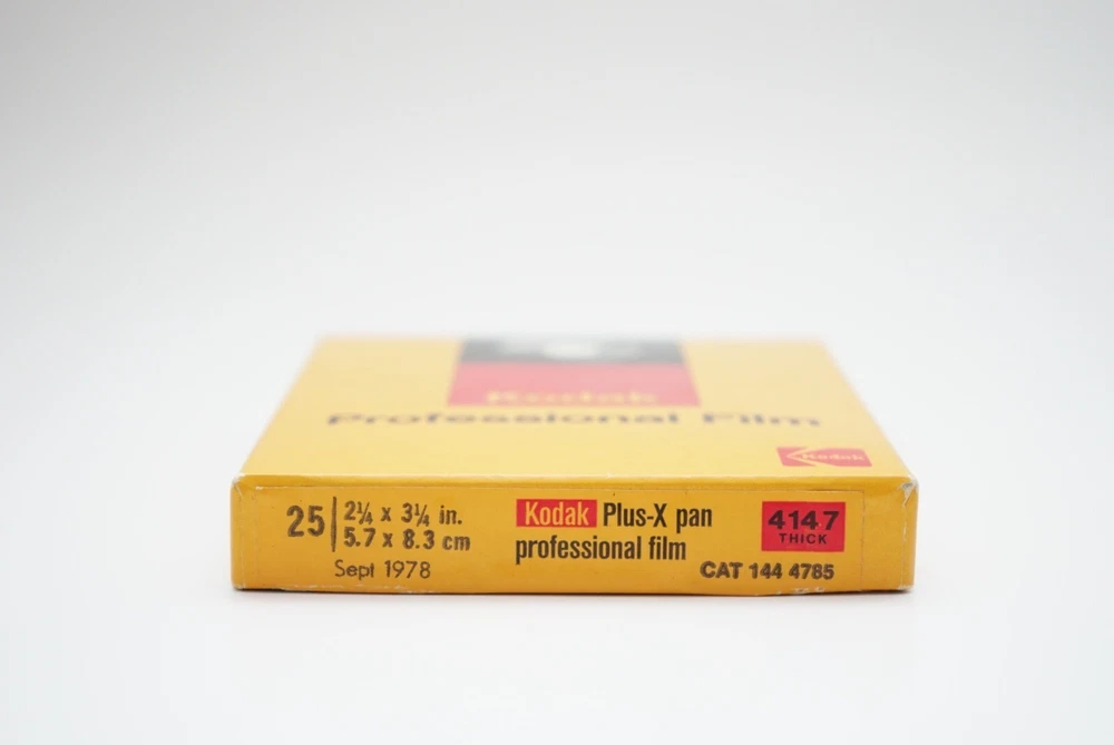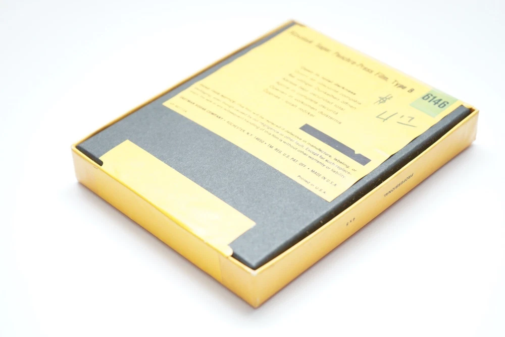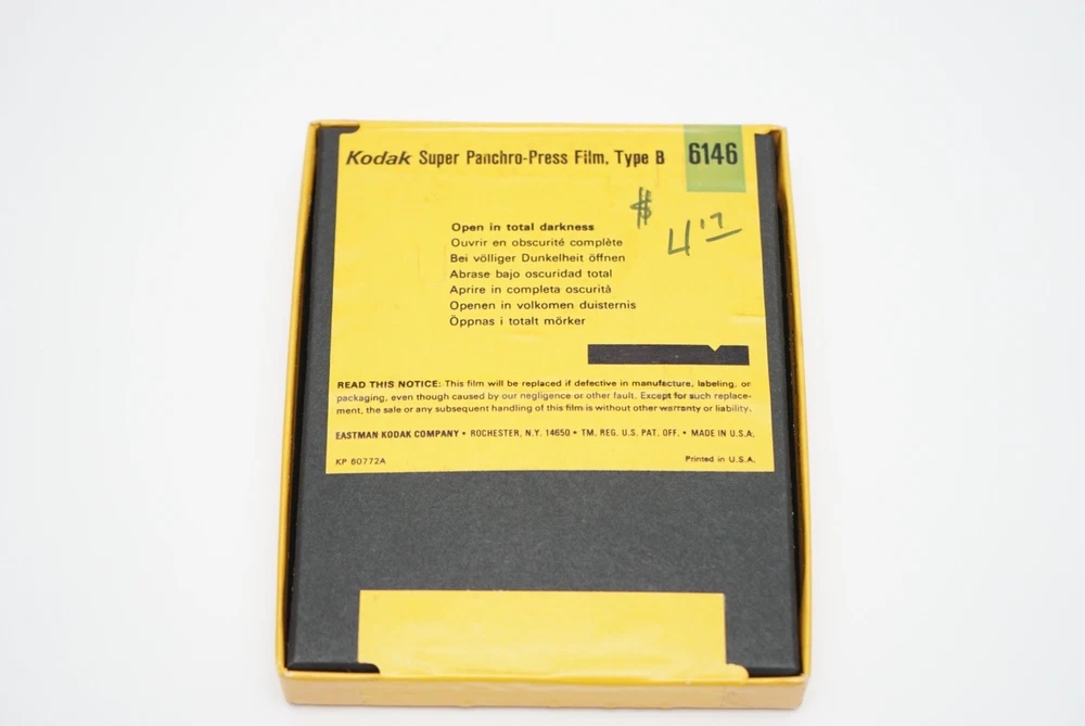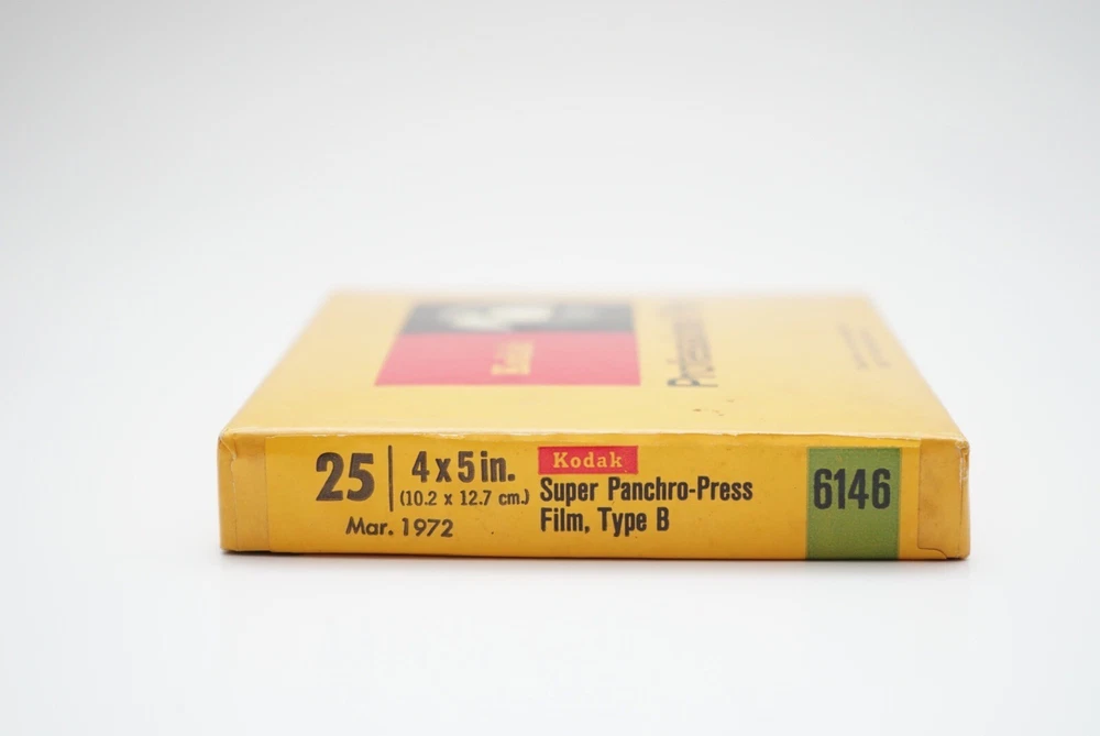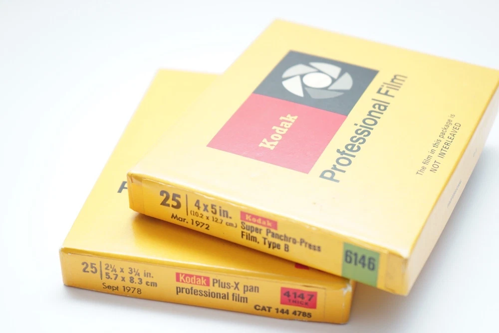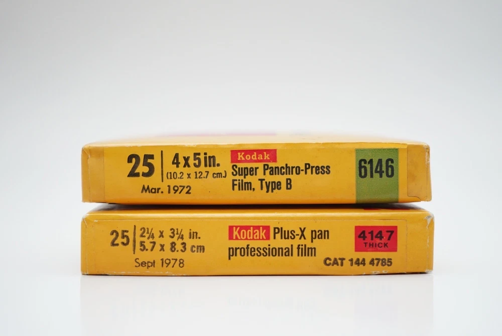4x5 Super panchro-press film type B sheet film. Unopened and expired in Mar 1972 2 1/4 x 3 1/4 plus-x pan professional film sheet film. Opened/unknown number inside. Expired in Sept 1978