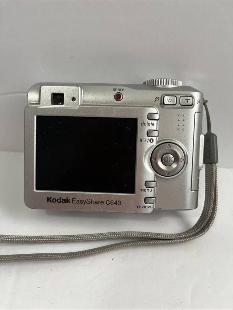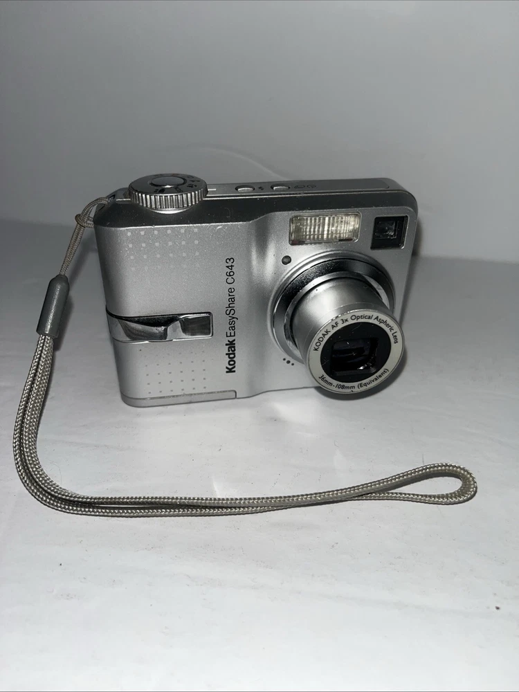 This Kodak EasyShare C643 compact digital camera is a great addition to your photography collection. With a maximum resolution of 6.1 MP and a 3x optical zoom, this camera produces high-quality images that are sure to impress. The camera features a 2.4-inch screen size and a silver color that looks stylish and sleek. In addition to its great image quality, this camera also comes with a host of features that make it easy to use, including direct print, audio recording, date/time stamp, auto power save, and PictBridge support. The camera uses AA and CR-V3 batteries and weighs 5.1 oz. It is a perfect choice for anyone looking for a reliable and easy-to-use digital camera.
