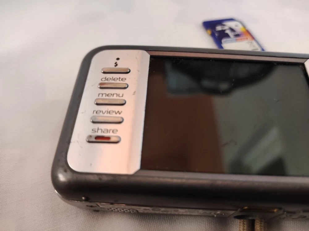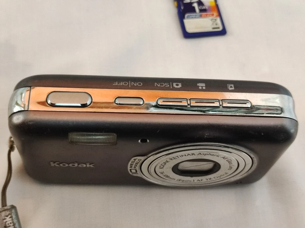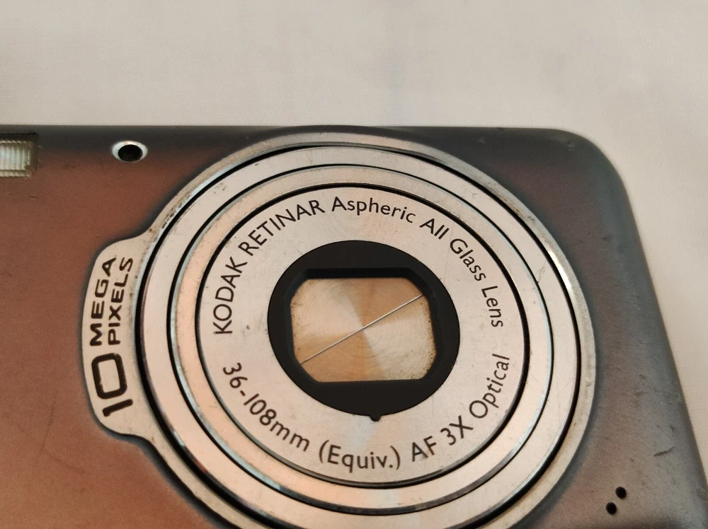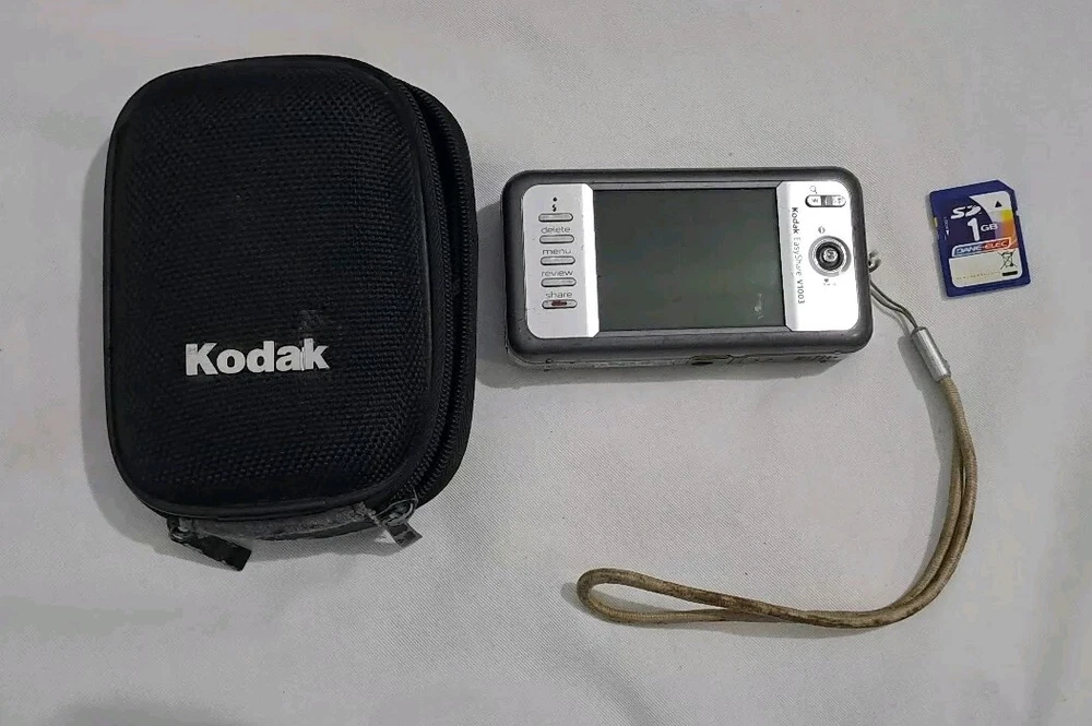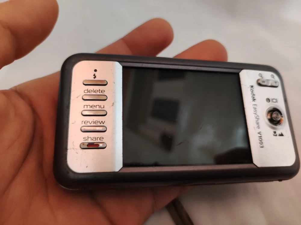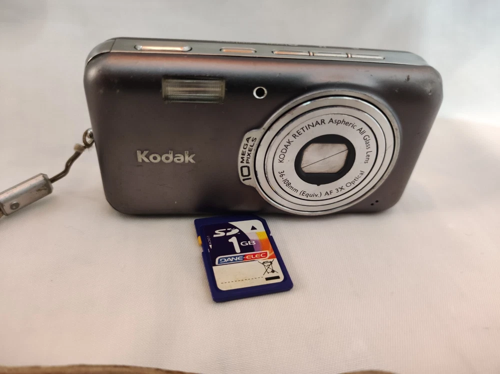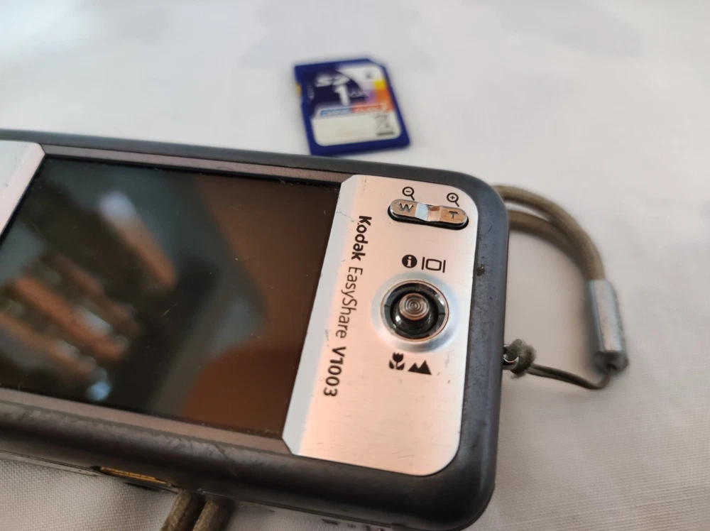Kodak EasyShare V1003 Digital Camera in Gray. Enjoy its 10.0 MP maximum resolution and 3x optical zoom lens for crisp and clear images.has a 2.5-inch The camera is powered by a Lithium-Ion battery and can connect via USB. It comes with a 1GB SD card and battery no charger or case are included . The lens make some noises when you turn the camera on or when you shooting a video or trying to take a picture and noises can be heard when you see the video you recorded
