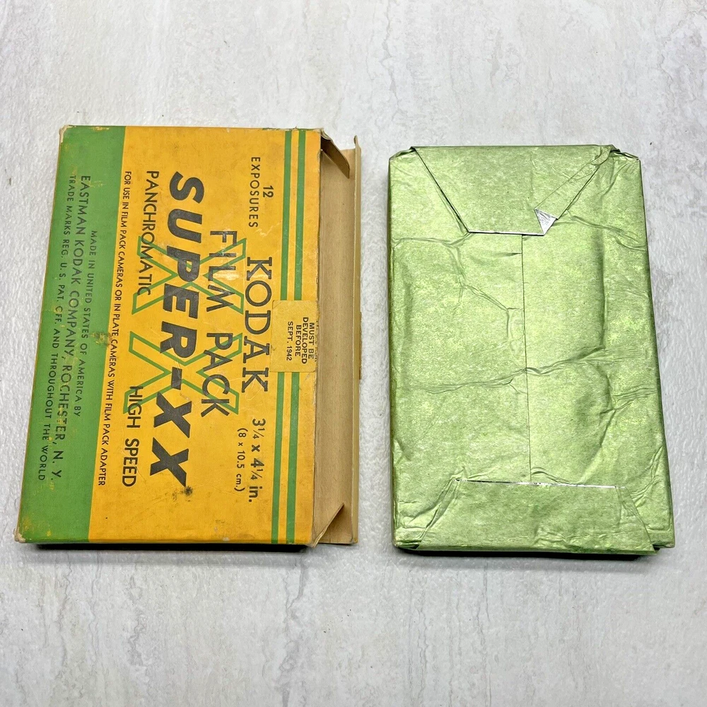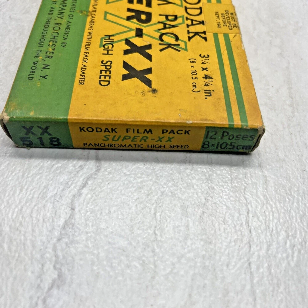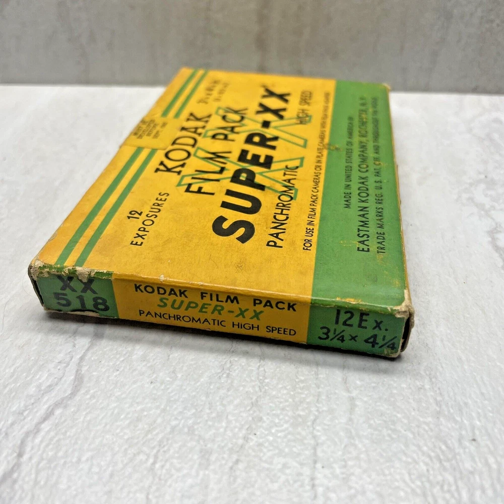 Vintage Kodak Super-XX Film Pack XX518 - 3 1/4 x 4 1/4 Panchromatic The box has wear, fading, scuffing, tearing, creasing, marks, etc. The seal is broken with open box, but the film is still wrapped in paper. The film expired Sept 1942, but would make a good display piece. My definition of condition ("ok, good, great, etc.") may be different than yours, so please review the pictures closely to judge for yourself. I typically use USPS Ground Advantage for shipping (depending on weight and cost). Note: Vintage and/or preowned items generally have some signs of wear. Pictures are a part of the description and please use the zoom function when necessary. You're buying the items "as is." I do my best to provide good pictures and accurate details, but if there is an issue please let me know. A courtesy message to me before reaching out to eBay or leaving a negative review goes a long way. Thank you! 😊