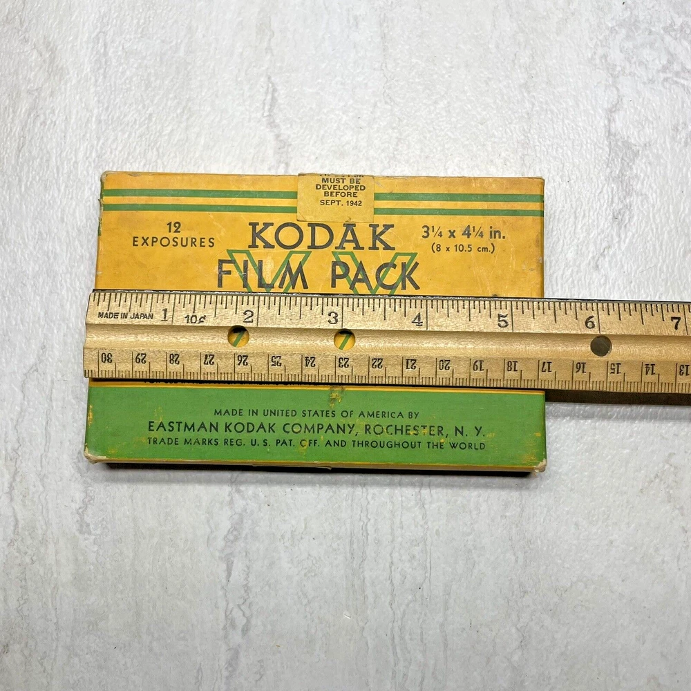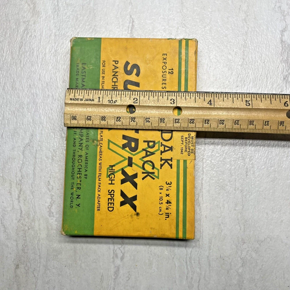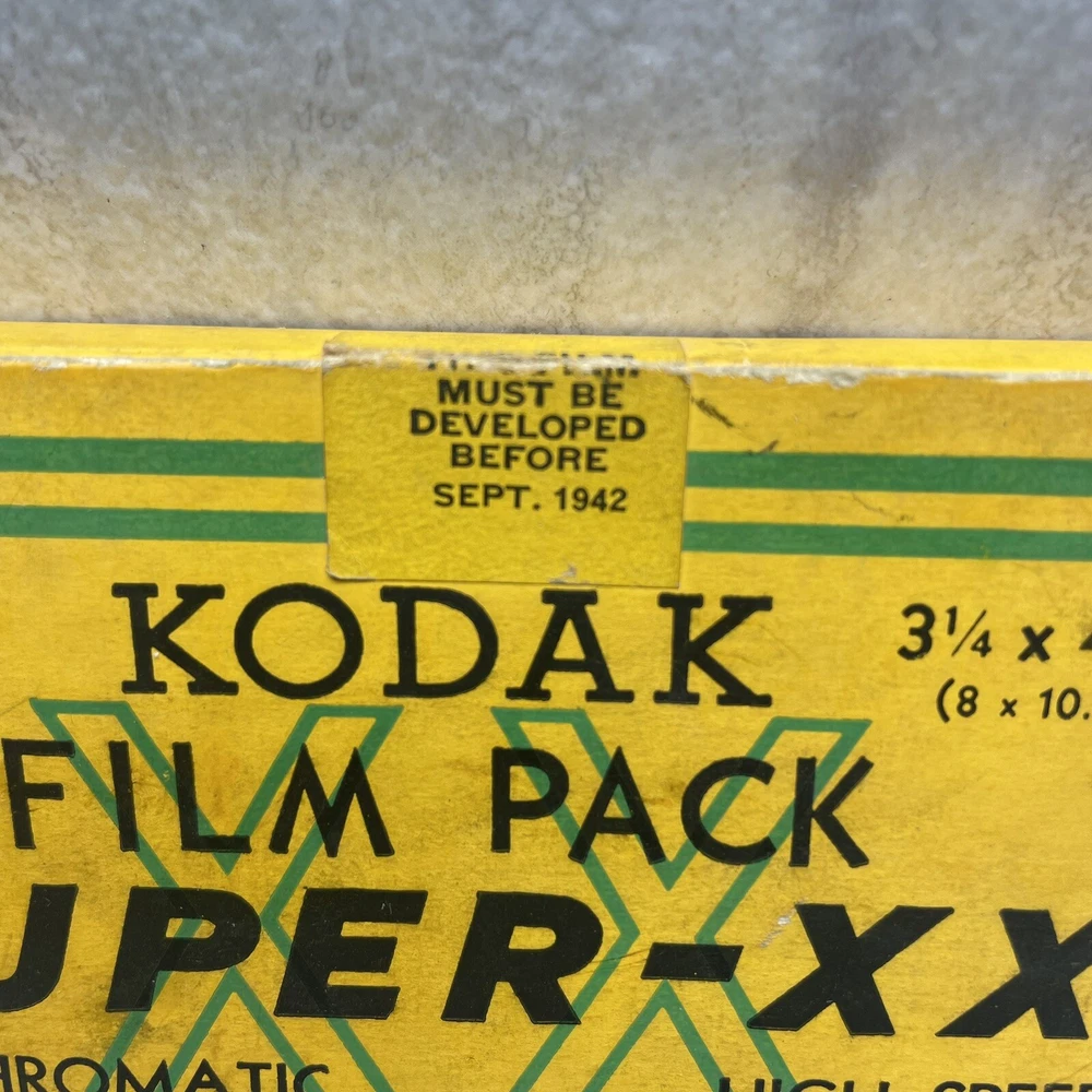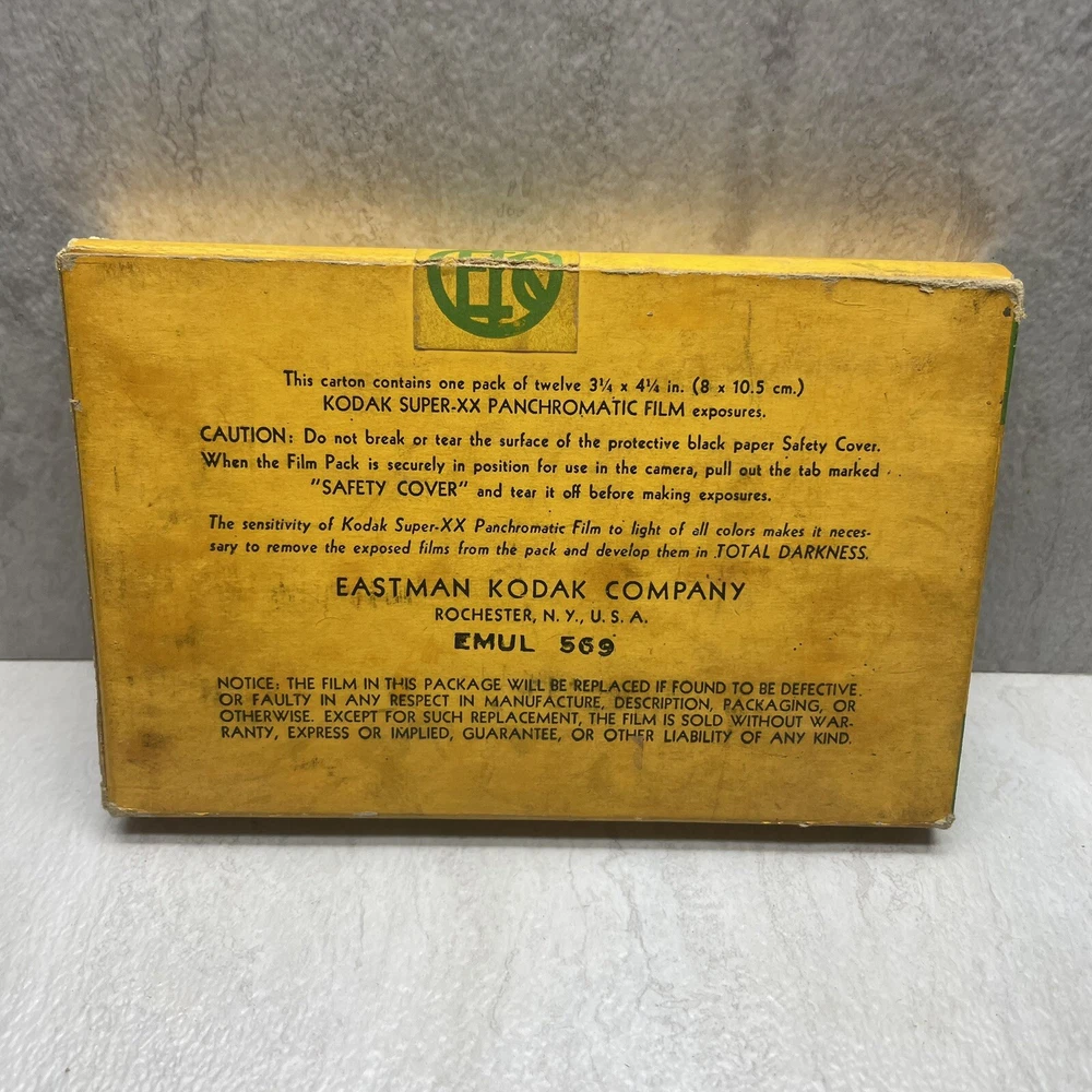 Vintage Kodak Super-XX Film Pack XX518 - 3 1/4 x 4 1/4 Panchromatic The box has wear, fading, scuffing, tearing, creasing, marks, etc. The seal is broken with open box, but the film is still wrapped in paper. The film expired Sept 1942, but would make a good display piece. My definition of condition ("ok, good, great, etc.") may be different than yours, so please review the pictures closely to judge for yourself. I typically use USPS Ground Advantage for shipping (depending on weight and cost). Note: Vintage and/or preowned items generally have some signs of wear. Pictures are a part of the description and please use the zoom function when necessary. You're buying the items "as is." I do my best to provide good pictures and accurate details, but if there is an issue please let me know. A courtesy message to me before reaching out to eBay or leaving a negative review goes a long way. Thank you! 😊