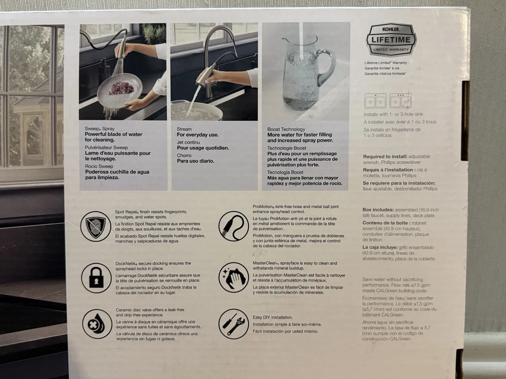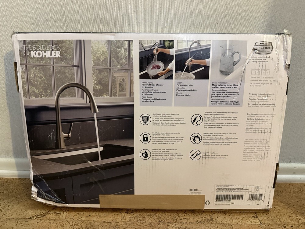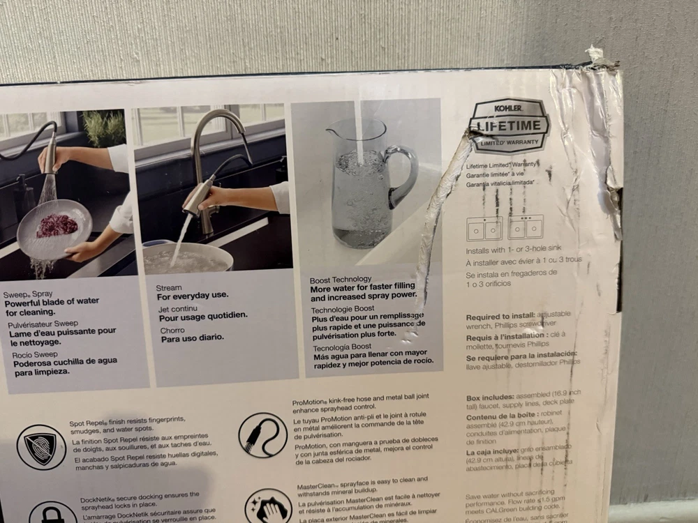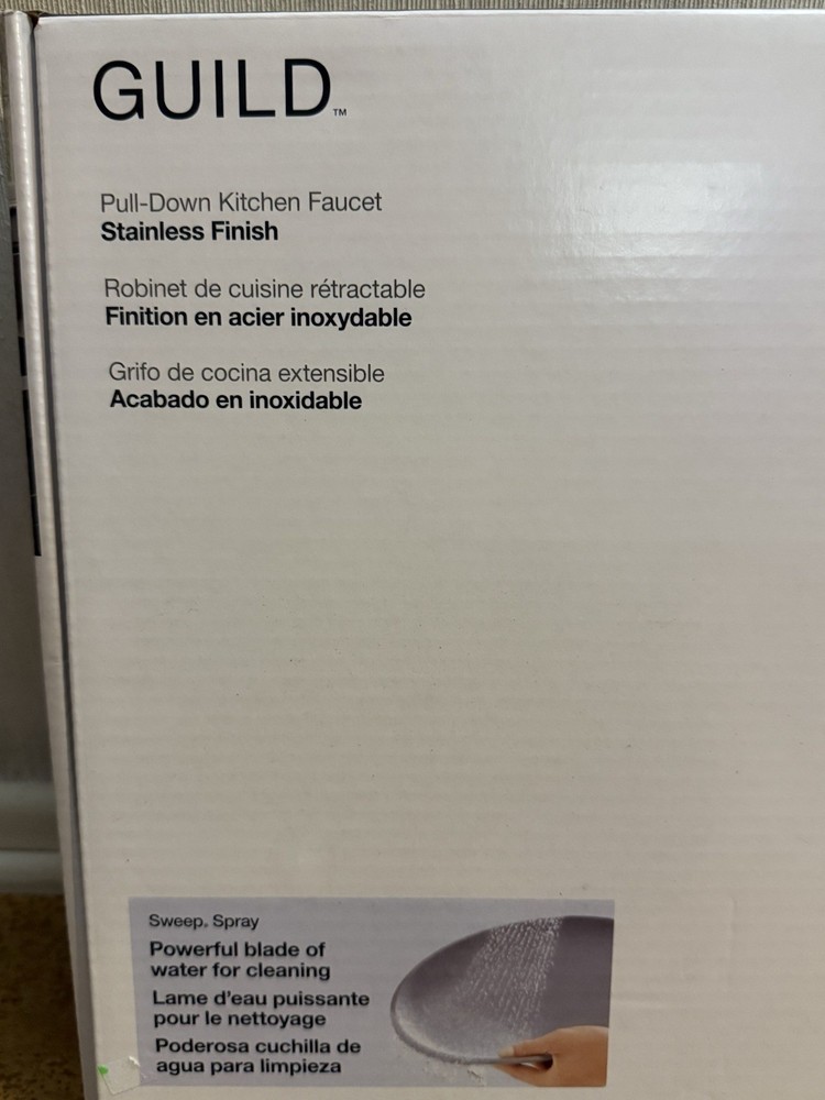 Kohler Guild Pull-Down Kitchen Faucet - Stainless Finish Open Box - Please Note Box is Damaged - Have Signs of Wear/Tear The Kohler Guild Pull-Down Kitchen Faucet in Stainless Finish is a workhorse faucet that blends classic design language with modern functionality Three-Function Sprayhead: Typically includes: Aerated Stream: A steady, splash-free stream for filling pots. Sweep Spray: A wider, forceful spray for cleaning. Boost Function: Adds extra water pressure for tackling tough messes. Contact us We can be contacted at any time through eBay messages if you have any questions, comments or product requests. We will respond to you within 24 hours and do our best to help you out! We encourage our customers to contact us with any questions or concerns! We'd like to be sure you are completely satisfied with your purchase.