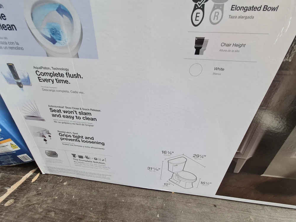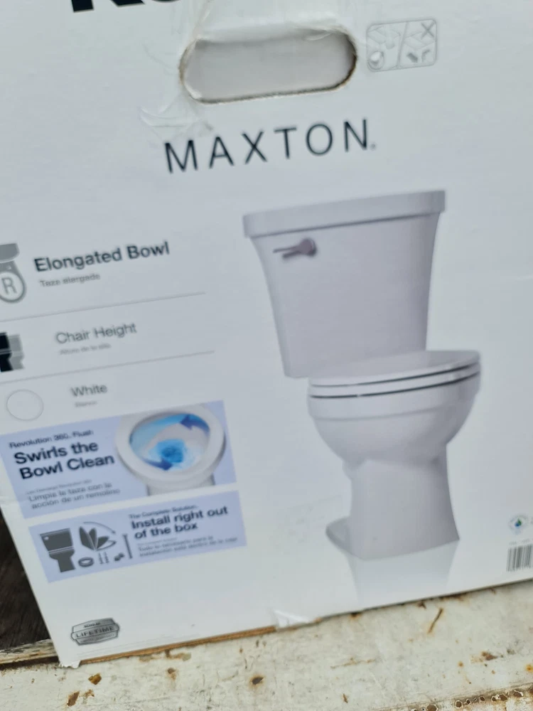 Has minor signs of use. One of the small tabs of the toilet tank cover is slightly cracked off. Please see photos. Includes brand new O-Ring. In original box. With gentle curves, Maxton delivers a softened approach to contemporary style. The Maxton toilet features AquaPiston technology, a patented flush engine that delivers a fast, powerful, and virtually plug-free flush. A 1.28-gallon flush provides significant water savings of up to 16,500 gallons per y ... Read More Features Two-piece design Elongated bowl offers added room and comfort Comfort Height feature offers chair-height seating that makes sitting down and standing up easier for most adults 1.28 gpf (4.8 lpf) Left-hand Polished Chrome trip lever View More Dimensions Overall Height 31-3/8" in. Overall Width 16-3/8" in. Overall Depth 29-5/16" in. Bowl Height Comfort Rough-in 12 in. Specifications Specifications Sheet Installation Three-bolt quick-connect installation Standard 12" (305 mm) rough-in