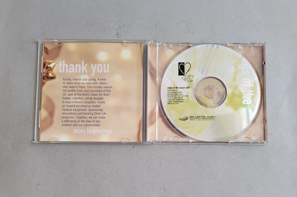 Record Label:EMI-CapitolType:AlbumArtist:VariousRelease Year:2001Release Title:Kohl's Cares For Kids: Songs Of The Season 2001Genre:Holidaygtin13:400830100268UPC:400830100268Format:CDOccasion:Christmas