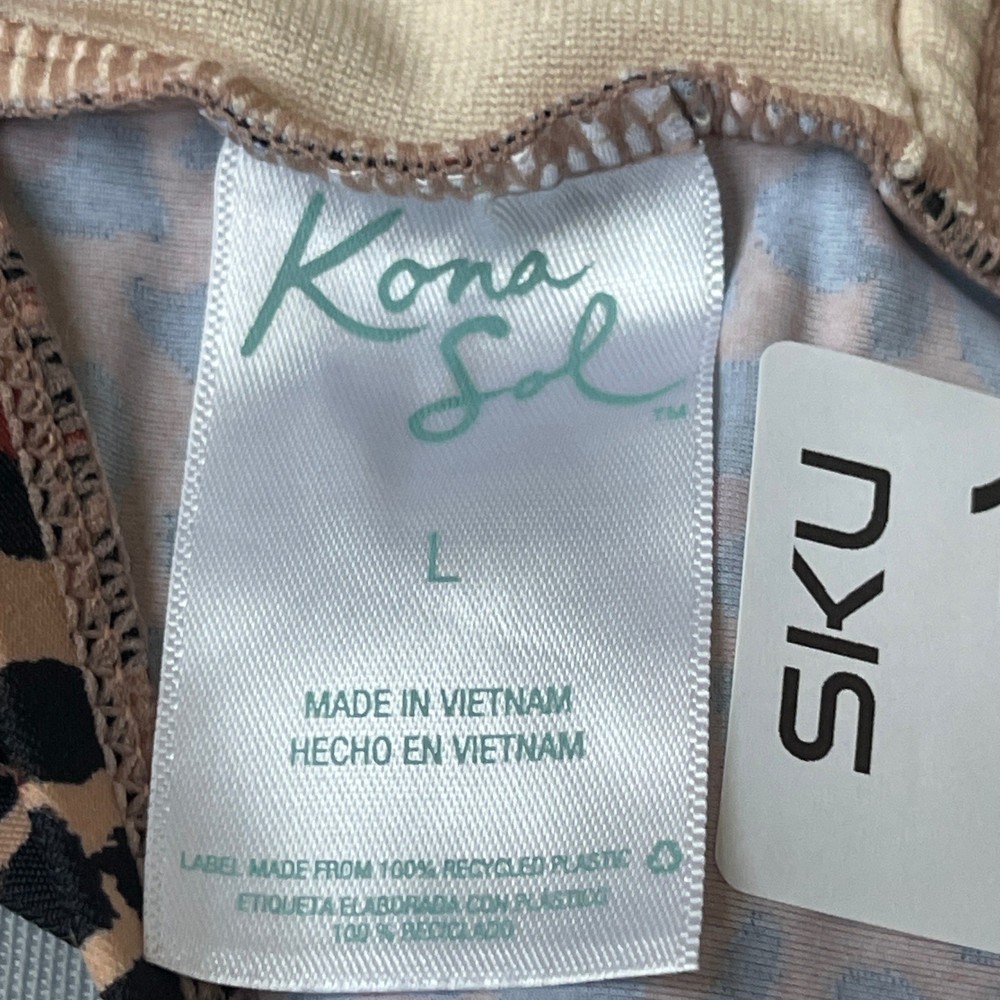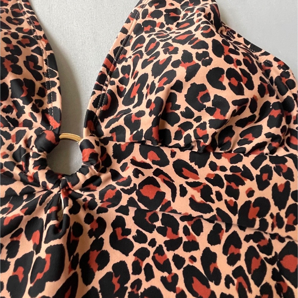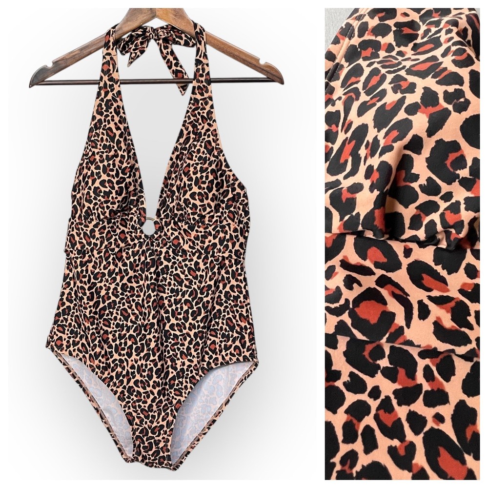 Chic one-piece swimsuit featuring a bold leopard print. This stylish swimsuit boasts a flattering halter neckline with tie closure, a plunging V-neck with a decorative ring detail, and a comfortable, full-coverage design. The built-in cups provide support and shaping, while the all-over leopard print adds a touch of wild sophistication. Perfect for lounging by the pool, swimming at the beach, or enjoying a tropical vacation. Measurements: • Pit to Pit: 15.5 in • Waist: 14 in • Length (Shoulder to Crotch): 27 in Type: One Piece Color: Beige, Brown, Black Department: Women Material: Nylon, Spandex, Spandex Blend, polyester Features: Built-In Cups, Halter Neck, Decorative Ring, Full Coverage, Tie Closure Pattern: Animal Print Accents: Ring Strap Type: Halter Keywords: one piece swimsuit, leopard print, halter neck, swimwear, bathing suit, womens swimsuit, Kona Sol, size L, beachwear, poolside, vacation, summer, animal print swimsuit, recycled materials