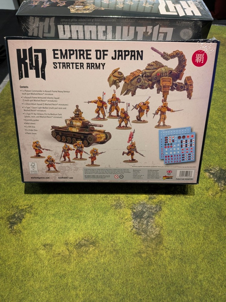 IN STOCK : Konflikt '47 Empire of Japan Starter Army — Imperial Japanese Rift-tech — NIB ✨ BOUTIQUE IN STOCK NOTICE: This massive starter army has arrived at our Florida facility and is ready for immediate dispatch . Skip the international customs headaches and the weeks of waiting for UK imports. We have this on the shelf in Port St. Lucie, ready to ship today. All orders are processed within 24 hours and shipped via USPS Ground Advantage. Stealth, Phasing, and Fanatical Devotion — The Empire of Japan The Empire of Japan uses the power of stealth, the capability to phase through solid objects, and fanatical devotion to their cause to launch coordinated close-quarters attacks before fading away just as quickly as they appeared. This starter army is the perfect way to begin your Imperial collection for Konflikt ’47 , arming you with a lethal array of units, complete with Order and Rift Dice. At the core of this force is an Assault Platoon led by an LMG-armed Platoon Commander in heavy powered armor— a sculpt exclusive to this boxed set . The platoon is anchored by Assault-Frame armored infantry and a Ghost Attack Squad, capable of redeploying anywhere on the battlefield by exhausting a Rift Die and bringing their Shiboru rifles to bear on unsuspecting targets. Why the Empire of Japan Starter belongs in your collection: Exclusive Commander: Includes the Assault-Frame Platoon Commander available only in this set. Rift-Tech Mastery: Field the terrifying "Ghost" infantry capable of phasing through terrain to strike where the enemy is weakest. Heavy Support: Includes the Sasori Light Walker and a Chi-Ha tank re-equipped with a devastating Shiboru Cannon. 2nd Edition Optimized: Fully compatible with the 2026 ruleset and updated unit profiles. This Boutique Starter Army Includes: 1x Empire of Japan Platoon Commander (Assault-Frame Powered Armor — Exclusive ) 5x Assault-Frame Armoured Infantry 5x Ghost Attack Infantry 1x Type 7 Sasori Light Walker 1x Type 97-Kai Shiboru Chi-Ha Medium Tank 5x Konflikt ’47 white Order Dice 5x Konflikt ’47 yellow Rift Dice 1x Waterslide transfer sheet The Boutique Advantage: Ships from Port St. Lucie, FL: Your army is already in the US. We ship next business day so you can get to the hobby table faster. Collector-Grade Shipping: This is a large, heavy box. We ship it in a reinforced, double-walled shipping container with premium internal padding to ensure the retail box remains in mint condition. Fast Dispatch: We work late so your reinforcements arrive early. Note: Models are supplied unassembled and unpainted. Konflikt '47 2nd Edition rules required for play. SKU: 452601203 Vendor: Warlord Games #Konflikt47 #WarlordGames #EmpireOfJapan #ImperialJapaneseArmy #WeirdWarII #RiftTech #BoutiqueWargaming #ShipsFromFlorida #NIB #Wargaming #MiniaturePainting #K47