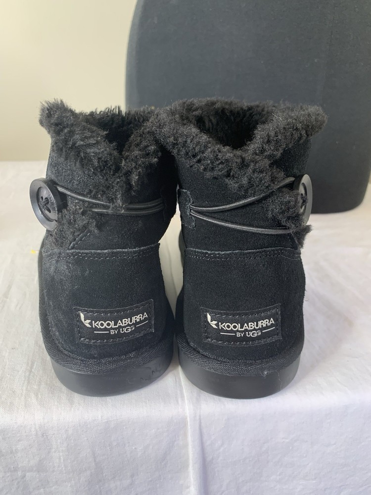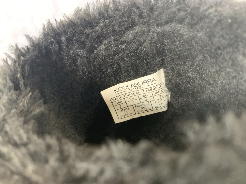 The Koolaburra UGG Boots Kid 2 Winter Black Suede Pull On are stylish and comfortable boots for unisex kids in size 2 (US) or 1 (UK). Made with black suede and featuring a round toe shape, pull-on closure, and flat heel, these boots are perfect for casual occasions in all seasons. The shearling fabric lining provides added warmth, while the ankle height and lace accents add a trendy touch. With a rubber cleat type and faux fur insole, these UGG boots offer both style and comfort for young wearers looking to stay cozy and fashionable.