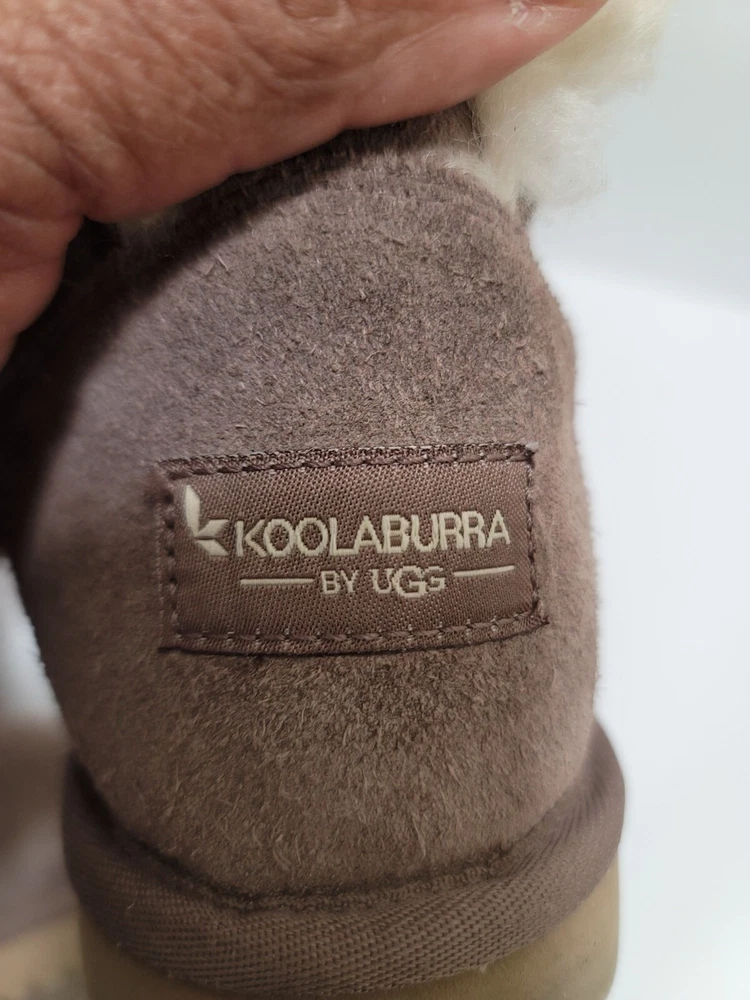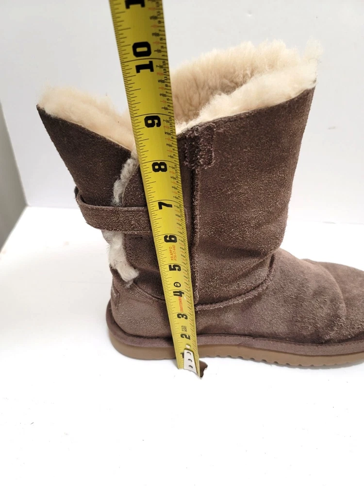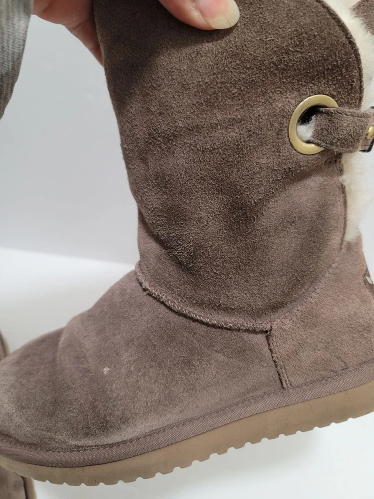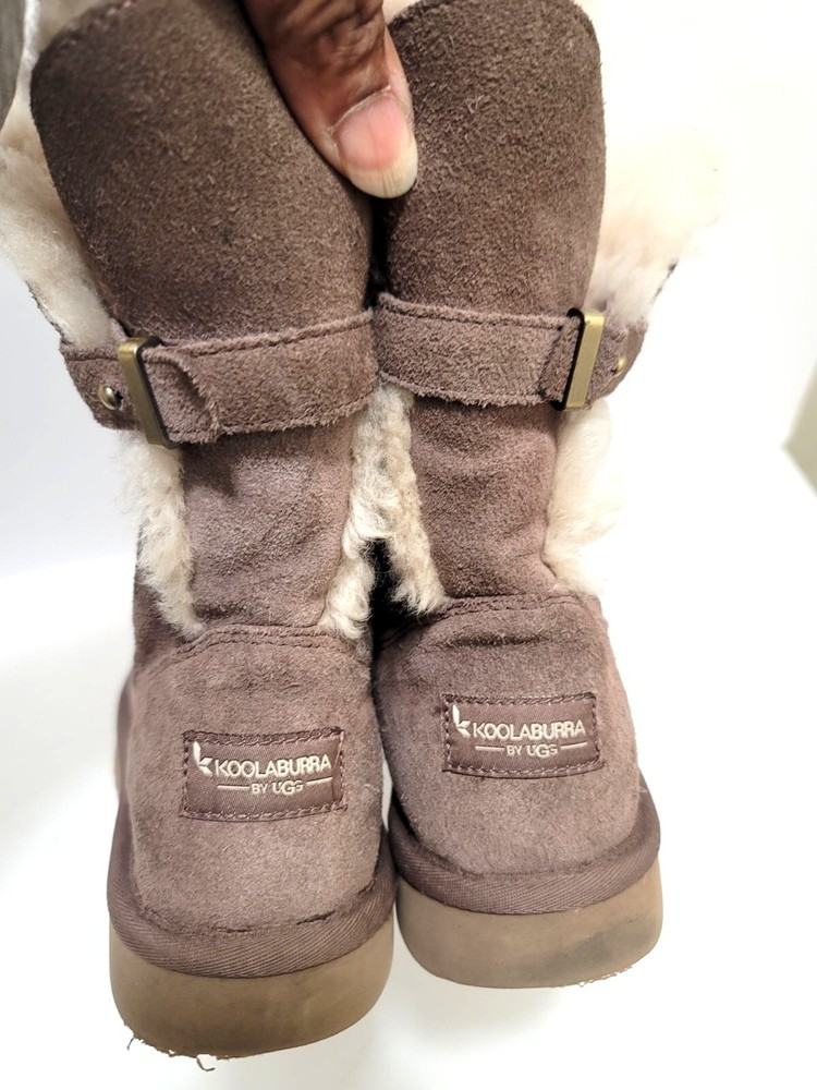 These Koolaburra by UGG boots offer a luxurious feel with genuine shearling lining. Crafted from soft suede, they provide warmth and style for cooler seasons. Durable construction ensures long-lasting wear, while the neutral brown complements various outfits. Ideal for both casual and more polished looks. • Genuine suede upper • Shearling lining for warmth • Pull-on style • Round toe design • Durable rubber sole • Decorative buckle detail CONDITIONS use, good condition. some water stains. Light wear on soles and slight creases on the upper. see photos for flaws details.