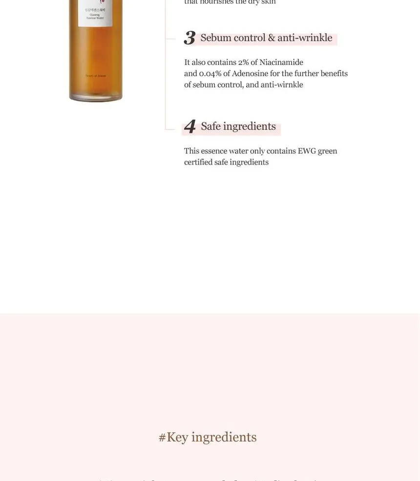 Infused with 80% ginseng root water as well as a uniquely formulated ginseng complex to revitalize dry skin and control sebum, this hydrating toner leaves skin plumped-up and wrinkle-free. Safe for use on sensitive skin. It helps to nourish and hydrate the skin with a long-lasting effect . The brand also highlights Niacinamide (Vitamin B3, oil and moisture regulation) and Adenosine (anti-aging, skin-restoring) as its key ingredients. Other honorable mentions go to Propanediol (humectant) and Sodium Hyaluronate (hydration).