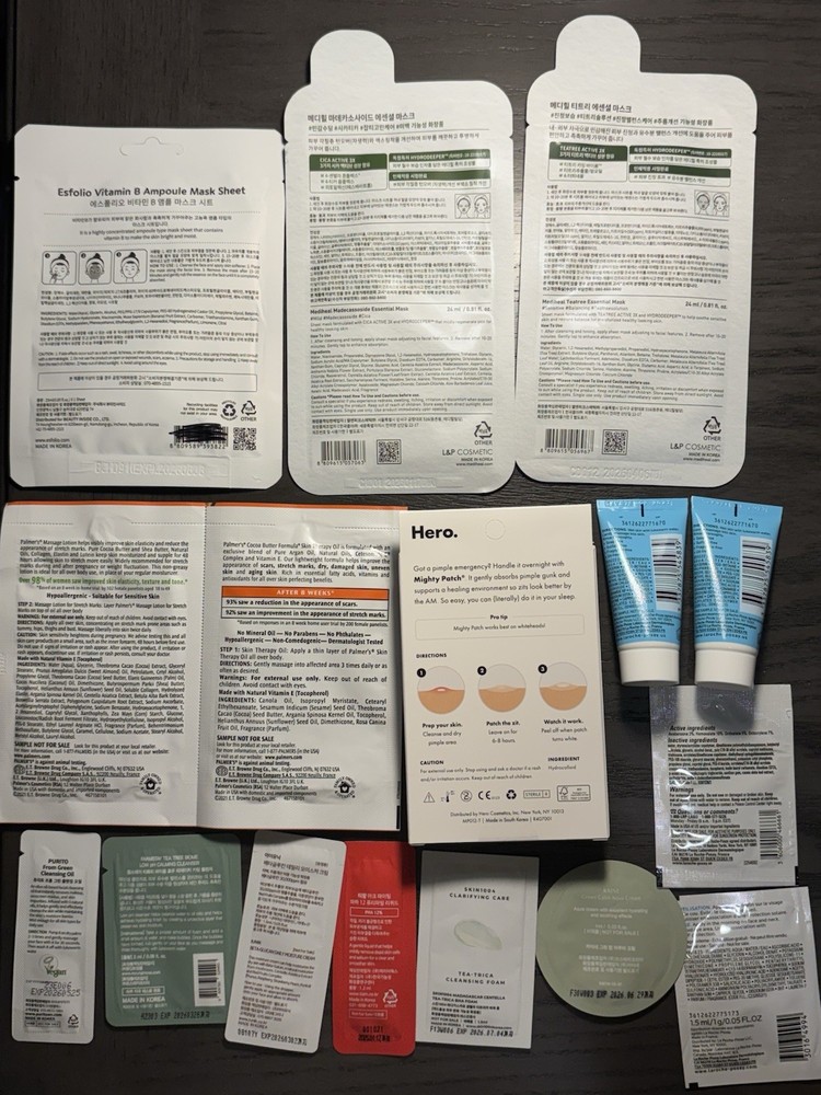 A bunch of samples plus full-size products that I received as gifts with purchases. Everything is NEW and UNOPENED. Includes: • 1 esfolio face sheet mask • 2 Mediheal face sheet masks • 1 brand new and sealed box of Hero cosmetics Mighty patch (original) - 24 count • 2 samples of La Roche-Posay Toleriane purifying foaming cleanser • 1 sample of Palmer’s skin therapy oil • 1 sample of Palmer’s massage oil for stretch marks • 1 sample of Purito cleansing oil • 1 sample of Farmstay cleanser • 1 sample of íunik cream • 1 sample of Kaine cream • 1 sample of AC Fighting PHA • 1 sample of Madagascar Centella BHA foam • 1 sample of La Roche-Posay vitamin C serum • 1 sample of La Roche-Posay Anthelios melt-in milk sunscreen Expiration dates are on back of each sample. *AC Fighting PHA expires in December 2025* You will receive everything pictured! *Price is final! Not accepting offers :)*