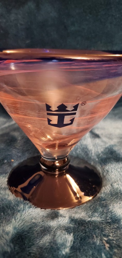 This is a Kosta Boda Royal Caribbean martini glass, featuring a cobalt blue and pink swirl design with the Royal Caribbean logo. Blue, purple. pink, peach swirl design