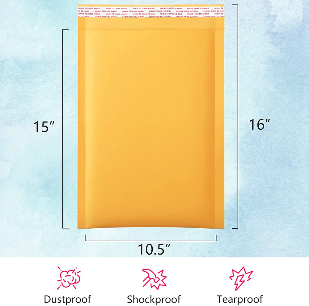Kraft BUBBLE MAILER SIZE - External size: 10.5x16 Inch, Inside size: 10.5x15 Inch. Yellow color. Pack of 25pcs. PADDED MAILERS - The padding is sufficient to mail Multiple items and the items that needed protection. Keep your products safety and make your customer no complaint. TIGHT SEAL - The self-seal closure provides a reliable, tamper-evident tight seal to secure all enclosures. Extra smooth surface is perfect for handwriting, labeling and stamping. International products have separate terms, are sold from abroad and may differ from local products, including fit, age ratings, and language of product, labeling or instructions. Product Description UCGOU 10.5x16" Yellow Kraft Bubble Mailers We UCGOU is the professional manufacturer specializing in producing all sorts of poly mailers and bubble mailers. Sustainable innovation is our unremitting pursuit. Having advanced technology and equipment, we are dedicated to offering packaging and shipping solutions to our customers with excellent products and service. Padded Envelopes Protection Lined with bubble, Bubble mailers seal well and the padding is sufficient. The bubble mailer envelopes provid more protection during transit as compared to basic poly mailers and don't add too much bulk, as a result the shipping is so much better than the complicated larger packages. Enhence Company Image and Your Brand Tape, wrapping film and corrugated cardboard box. This is too much trouble when you prepare to ship somethings. It's time to say bye to the troublesome!! Come to UCGOU! Send your package in clean, simple but grand style which would help to upgrade your company professional image. Believe us. Bubble mailers with bright and pure color will allow customers to easily identify their orders from your shop when they arrive in their mail.