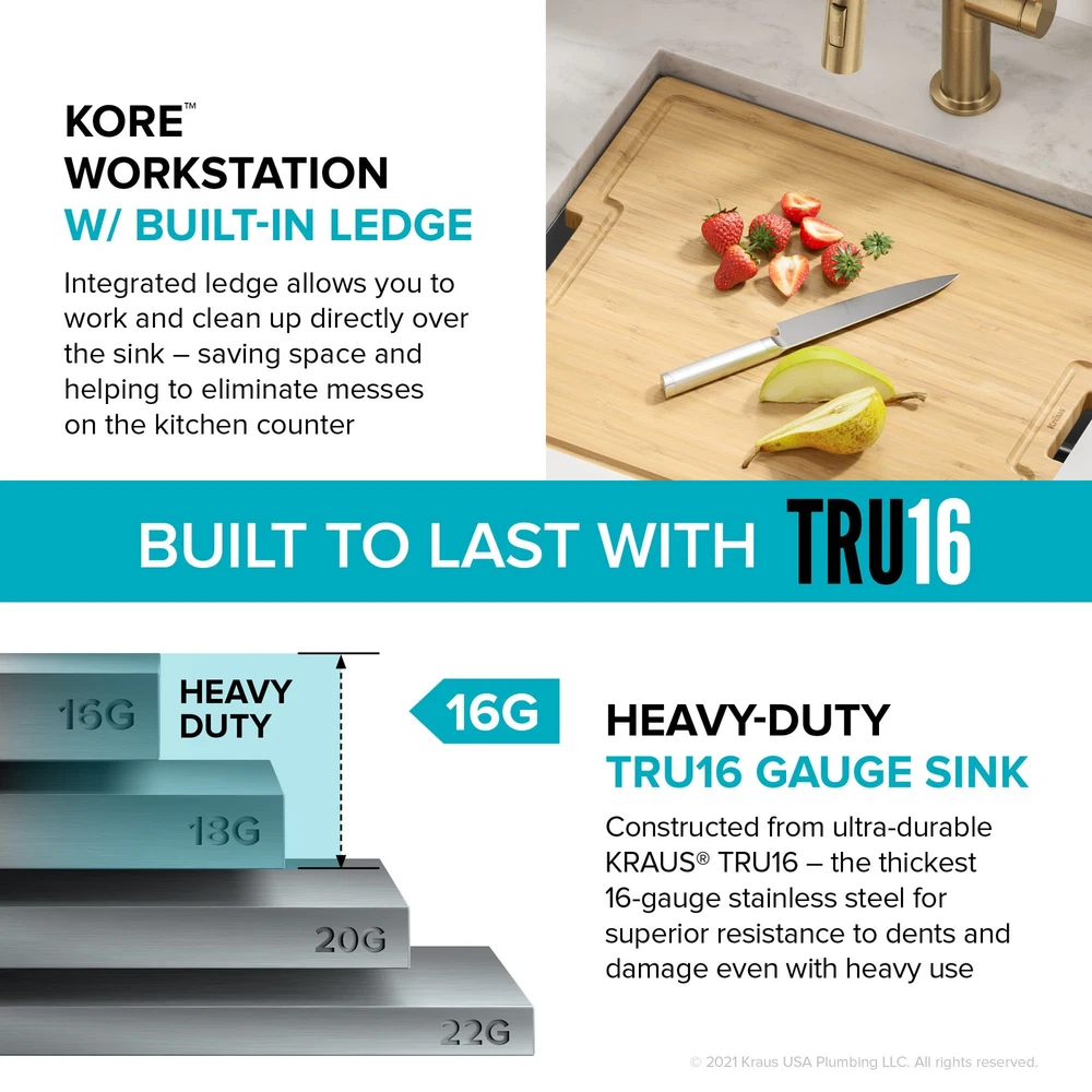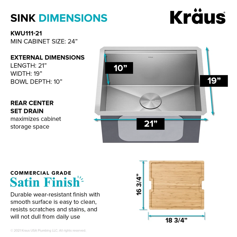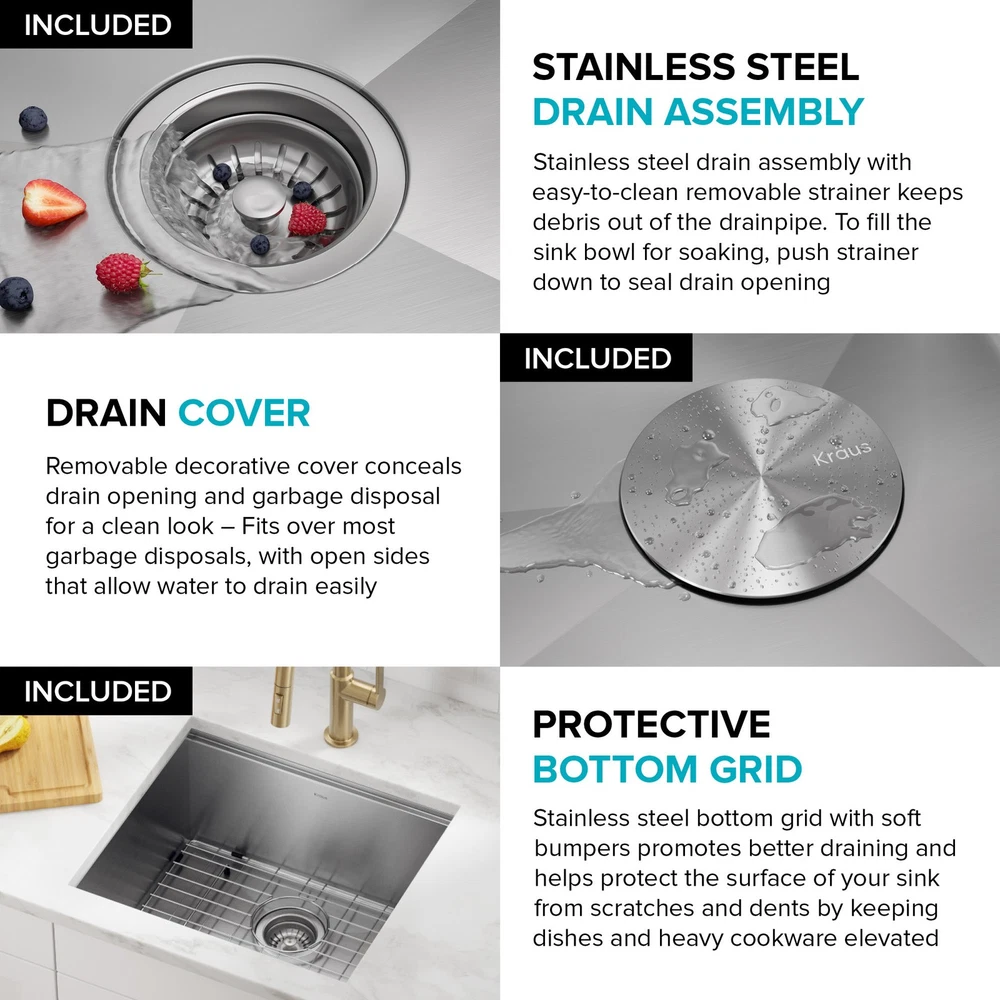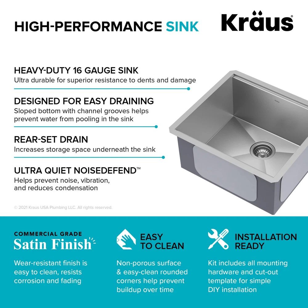 Powered by Frooition Top Products Kitchen Bathroom Lighting Fans Hardware Decor & Organization Kraus KWU111-21 Kore 21" Undermount Single Basin Stainless Steel Kitchen Sink with Basin Rack, Basket Strainer, Cutting Board, and NoiseDefend Technology Overview Item Description The Kore workstation sink is engineered with an integrated ledge for accessories, creating a multifunctional workspace that minimizes clutter around the sink. Kit includes cutting board and roll-up dish rack that allow you to work right over the kitchen sink. Thick 16-gauge stainless steel sink offers maximum durability. Undermount sink installation creates a seamless transition from sink to countertop for a modern look and easy cleaning. Large NoiseDefend sound dampening pads reduce sink noise for a quieter kitchen. smooth finish makes the stainless steel kitchen sink easy to keep clean, with channel grooves for better draining. Sink for kitchen comes with grid, drain, and hardware for undermount kitchen sink installation. Also available in drop in sink design. Kraus KWU111-21 Features: Covered under Kraus's limited lifetime warranty Constructed from 16 gauge stainless steel Undermount installation - sink will install under the countertop Single basin design for maximum work space Sound absorbent construction to prevent dish clatter and under cabinet condensation Rear drain location increases available space under the sink Coordinates with products from the Kore line All mounting hardware required for assembly is included Kit includes: workstation sink, protective bottom grid, heavy-duty bamboo cutting board/sink cover, drain assembly with strainer, removable decorative drain cover, mounting hardware, cutout template Wear-resistant finish with smooth surface is easy to keep clean and not prone to corrosion or rust, gently rounded corners on the bottom of the stainless steel kitchen sink help prevent build-up for easy maintenance Sloped bottom with channel grooves helps prevent water from pooling in the sink, optimized slope helps keep fragile stemware from tipping over Heavy-duty bamboo cutting board/sink cover is not prone to cracking or warping, with a non-slip design and built-in grooves that prevent spills, easy to clean non-porous surface is resistant to odors and stains Stainless steel bottom grid with soft rubber bumpers promotes better draining and helps protect the surface of your sink from scratches by keeping dishes elevated Stainless steel drain assembly with easy-to-clean strainer helps keep food and debris from clogging the drainpipe, removable decorative cover conceals drain opening and garbage disposal for a clean look Easy to clean stainless steel kitchen sink with rounded corners on the bottom of the bowl to help prevent buildup over time, straight sidewalls and 90° angles maximize usable workspace in the sink for kitchen Modern design with clean lines, tight corners, and space-saving accessories that fit right over the sink, freeing up counter space for other tasks and creating a streamlined, contemporary look You can choose Kraus products with confidence - top-rated US-based customer service means no hassle for the life of your sink Kore stainless steel sinks with workstation ledge are available in a range of sizes and mounting options, including drop in sink, farmhouse sink, utility sink, and compact bar sink models Recommended accessories (sold separately): enhance the functionality of your kitchen sink with the Kraus garbage disposal (KWD100-100MBL) that gets rid of food waste in a flash, recommended kitchen faucet (KPF-1610) creates a contemporary look Certifications: cUPC (ASME A112.19.3/CSA B45.4), MASS Kraus KWU111-21 Technologies and Benefits: NoiseDefend™: Extra-thick rubber sound dampening pads cover 80% of sink base to absorb noise and vibration for a quieter kitchen experience Kraus KWU111-21 Specifications: Sink Length: 21" (left to right) Sink Width: 19" (front to back) Sink Height: 10-1/2" (top to bottom) Basin Dimensions: 19" L x 16" W x 10" D Minimum Cabinet Size: 24" Drain Connection: 3-1/2" Why Choose BuildInc? OUR PROMISE TO YOU About Us At Build, we promise to provide the best selection we can, most competitive pricing, and unmatched customer service. Our store has quality home improvement products from trusted manufacturers like Moen, American Standard, Delta, Kraus, Kichler, Progress Lighting, Schlage, Kwikset, Baldwin, Broan, NuTone, Air King, and Rev-A-Shelf. With over 200,000 home improvement products for you to choose from, we have just what you need to get your project done. Fast & Free Shipping We promise to make it our priority to get you your items as fast as we can. We ship from 440 warehouses around the country, ensuring that your product will get to you as soon as possible. We know you're eager to get your hands on your new purchase, we would be too. As a bonus, most items ship for free. Returns We are happy to accept returns of unused or defective items for a refund within 30 days from the date of delivery. For returns outside 30 days, please contact our Customer Service team to go over our options. For full details, please view the Shipping and Payments tab above. To initiate a return simply go to the eBay Returns Portal and submit a return request. We ask that all items be returned with all original components via a traceable method. Once your return is received and processed, we will quickly get your refund or replacement issued. If for any reason you are unsatisfied with your purchase or for product or warranty questions, please contact Customer Service team for assistance. More Items! View more great items Eurofase Lighting 38037 Leonardelli 48"W LED Abstract Chandelier - Chrome $2,028.00 Eurofase Lighting 37056-018 Admiral 6 Light 62"W LED Ring - Gold $7,602.00 Kingston Brass KF5335.TKF20 Trimscape Toilet Supply Kit - Brass $81.15 Innovations Lighting 916-5CR-15-25 Cone Chandelier Cone 5 Light - White $706.20 About Us | Shipping | Returns | Contact Us | 
