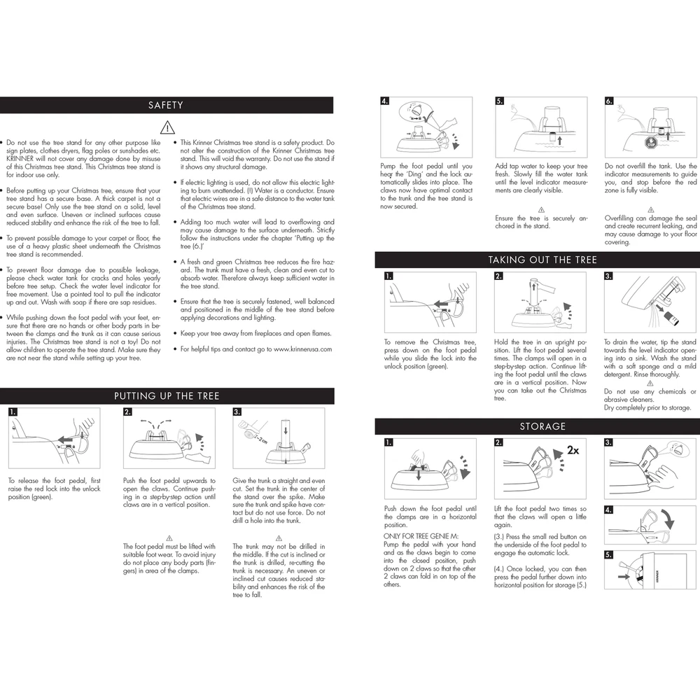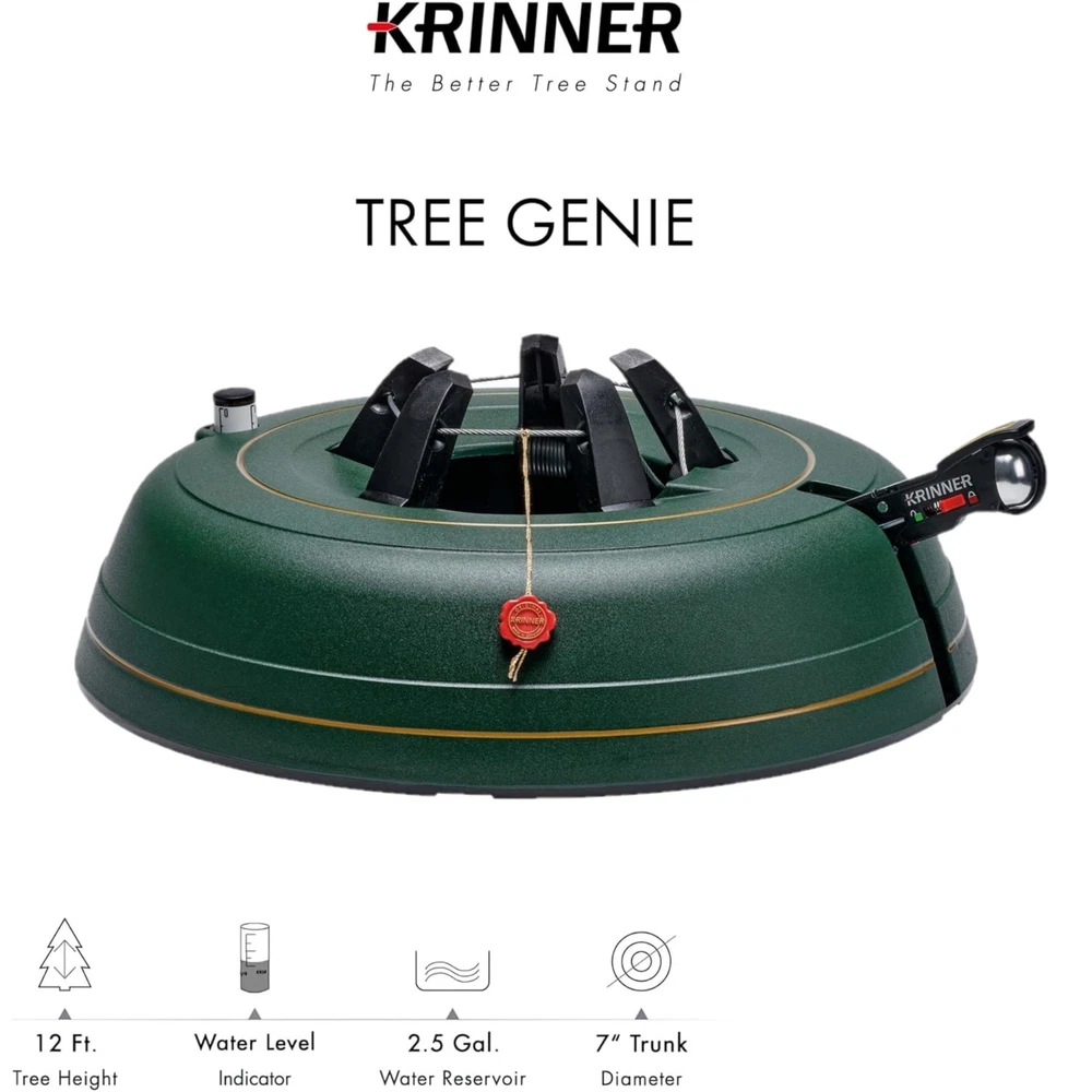 Krinner Tree Genie XXL Deluxe Christmas Tree Stand, Green PRODUCT DESCRIPTION Whether thick, thin, or crooked, your tree will be safely secured by the easy-to-use Krinner Tree Genie XXL Deluxe Christmas Tree Stand. General Features Simply pump the foot pedal 2.5 gallon water reservoir with level indicator 12 foot trees, 7” trunks 20” base diameter 18 lbs base weight ‘Ding’ Technology Patented safety belt Krinner’s original single cable operation Additional centering device for smaller trunks 5 safety claws Finally, you and your family can have a stress-free Christmas season with the easy-to-use Krinner tree stands! KRINNER’s Christmas Tree Genie XXL Deluxe is our most innovative stand. It comes with Krinner’s original single cable operation, which guarantees equal claw pressure around the trunk whether it’s thick or thin. Use the foot pedal to ratchet the claws. This stand boasts 5 claws that can be ratcheted tightly to secure the tree trunk. “Ding” technology tells you when the claws have securely closed around the tree. The patented safety belt: The ratchet mechanism opens step by step, so that the tree cannot fall over spontaneously. Another advantage is that the tree can be readjusted easily and safely. Keep your tree fresh and looking great as the Tree Genie XXL holds up to 2.5 gallons of water! Setting a tree up just got easier! Simply place your tree in the stand, hold it straight and step on the foot pedal until the bell rings.