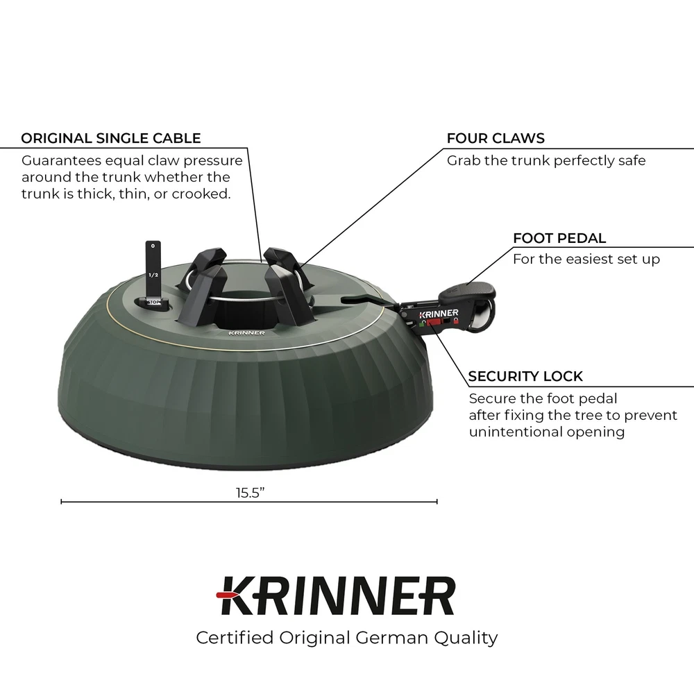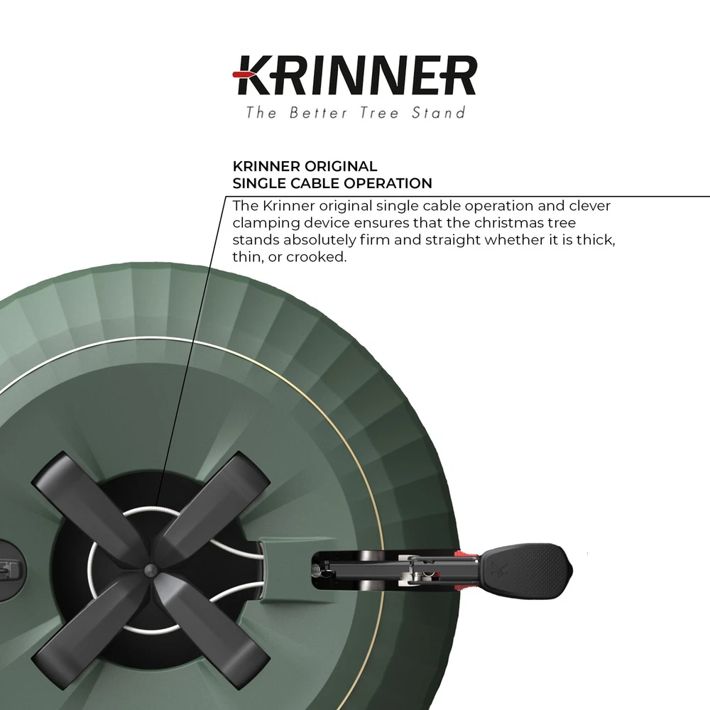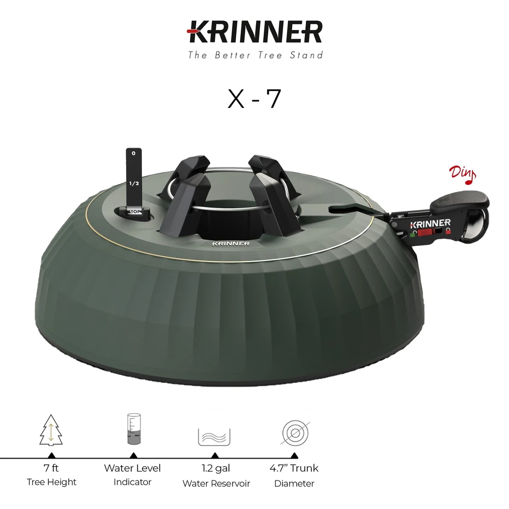 Krinner X-7 Deluxe Christmas Tree Stand, Green PRODUCT DESCRIPTION The Krinner X-7 Deluxe is the tree stand that will keep your tree fresh and looking great! Key Product Features Single cable operation guarantees equal claw pressure around the base of the trunk. This device ensures a firm and straight standing no matter the size/shape of the trunk. No need to tighten screws or use additional tools! Simply place your tree in the open stand, pump the foot pedal until the bell 'dings' to alert you that the 4 claws have perfectly grabbed the tree trunk. To finish, simply slide the pedal into the lock position! With the X-7 Deluxe, your tree can be comfortably adjusted at any time, no additional helping hands needed. Add tap water to keep your tree fresh. Slowly fill the tank with tap water until the level indicator is clearly visible, meaning it is full. The maximum water capacity is 1.2 gallons (4.5 liters) at a time. The dimensions of the X-7 Deluxe are 15.5" in diameter, 4.75" in height, and 13.2lbs in weight. This stand is made for trees up to 7 feet in height and a maximum trunk diameter of 4.5 inches. The X-Series Christmas tree stands impress with a new & festive, elegant design. With its new look and feel, the foot pedal also adapts to the new, innovative construction of the KRINNER X-7 Deluxe tree stand. The new, improved, practical water level indicator ensures even more precise filling of the water tank. This ensures watering throughout the life of the Christmas tree. The X-7 is equipped with the original single cable operation with 4 claws that grab hold of the tree trunk. Pump the foot petal until the bell ‘dings’ to announce that it is in place. To lock the tree in place, slide the pedal into the lock position. This tree stand ensures that your Christmas tree will stay exactly where you want it all season long. This stand can hold trees up to 7 feet in height with a trunk diameter of 4.5-inches. Enjoy the holiday season, with less stress when you have KRINNER’S X-7 Deluxe Tree Stand!