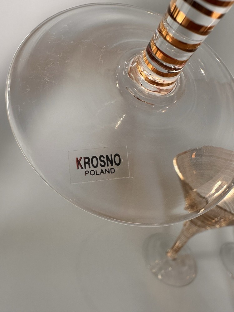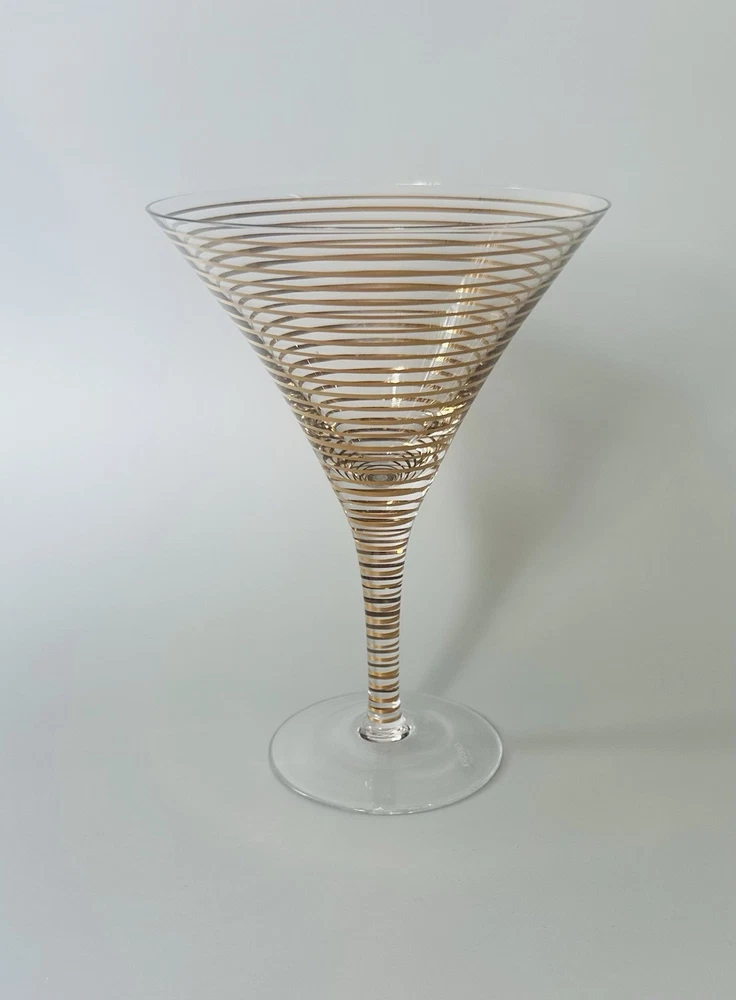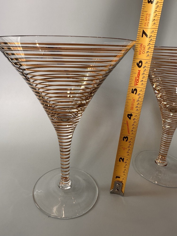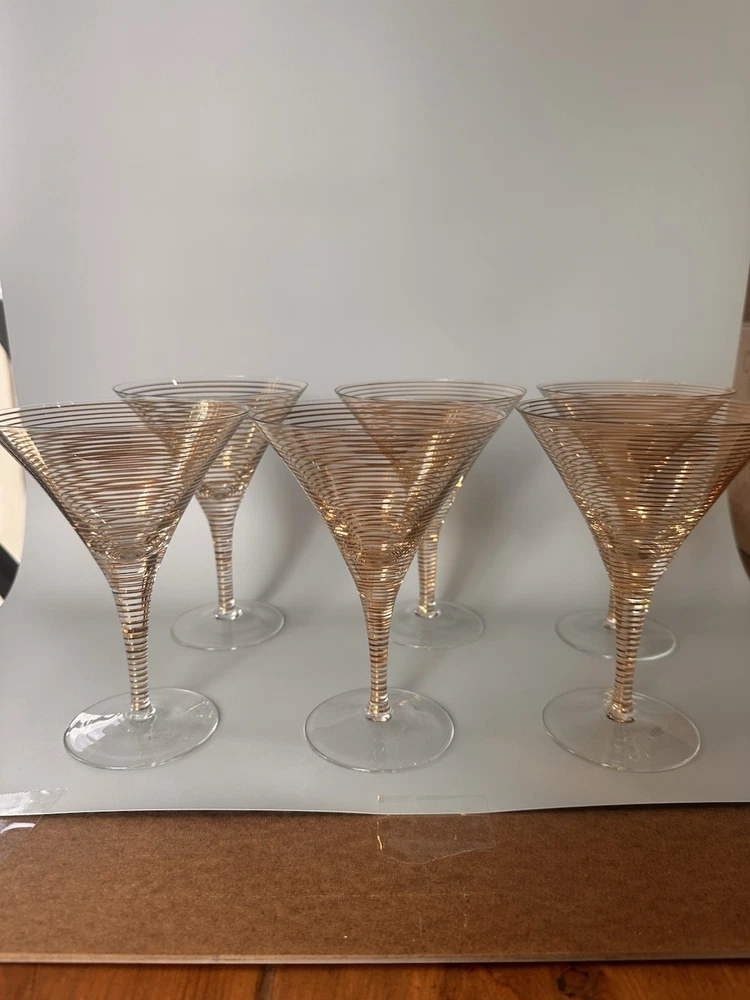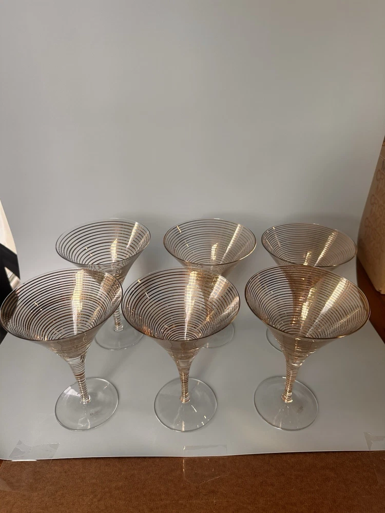 Krosno Martini Cocktail Glasses Gold Stripe Bands Lot of 6 Blown Glass Made in Poland. Note: One Glass Has Small Flea Bite on Rim, See Photos For Details. All Other Glasses Are In Mint Condition. 16-1234-12-4/25’
