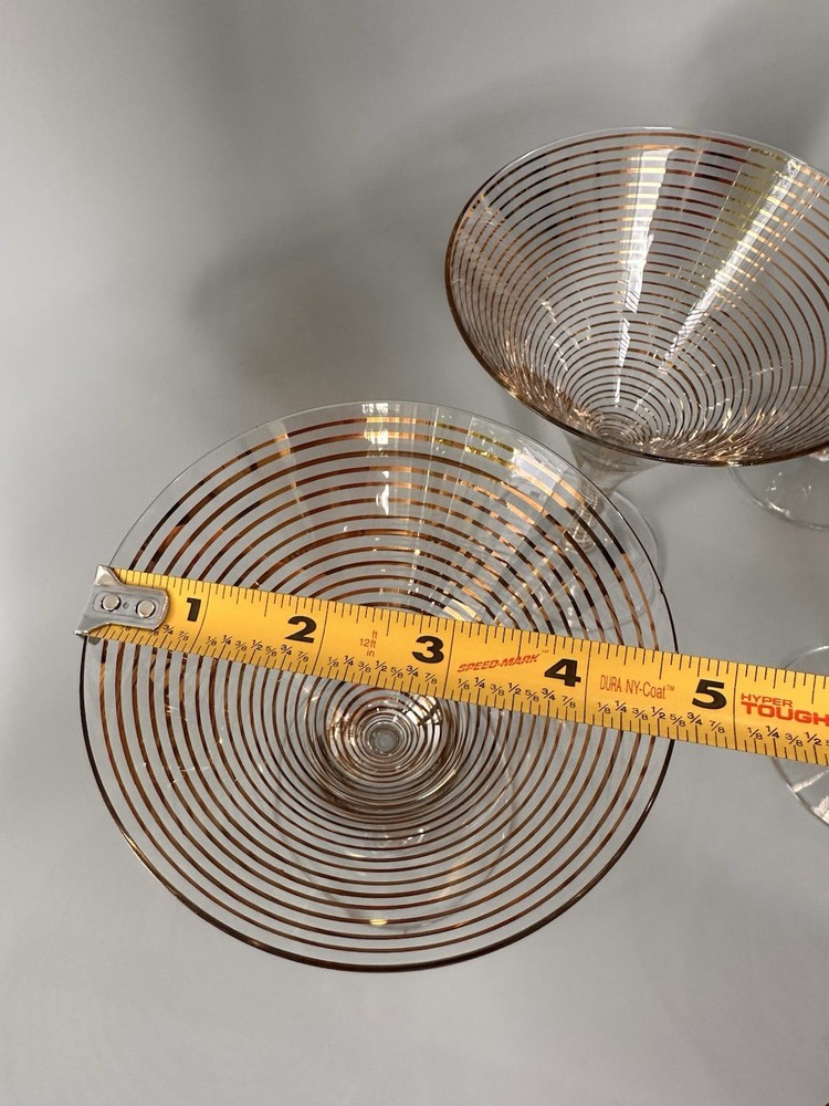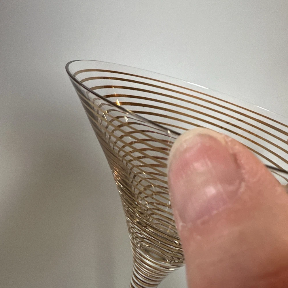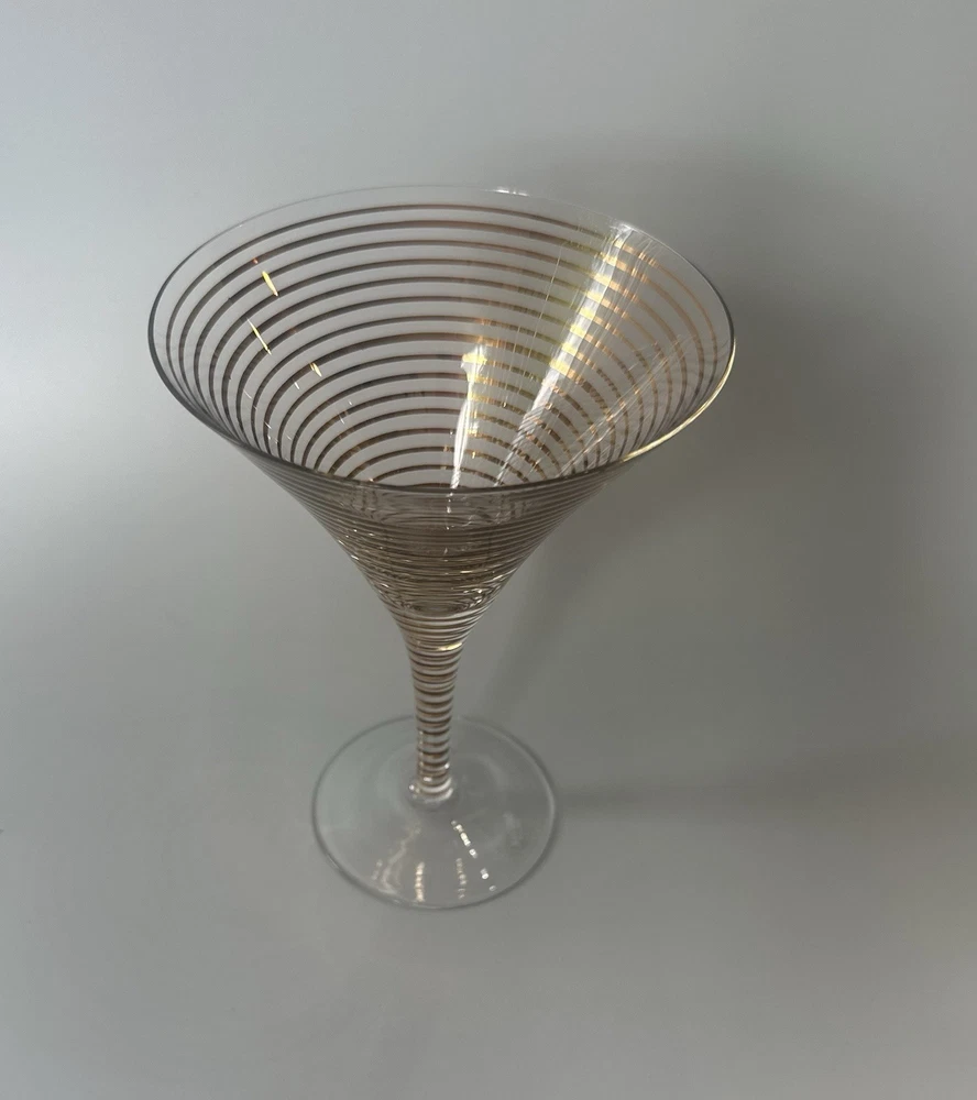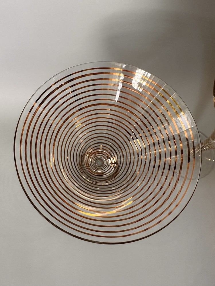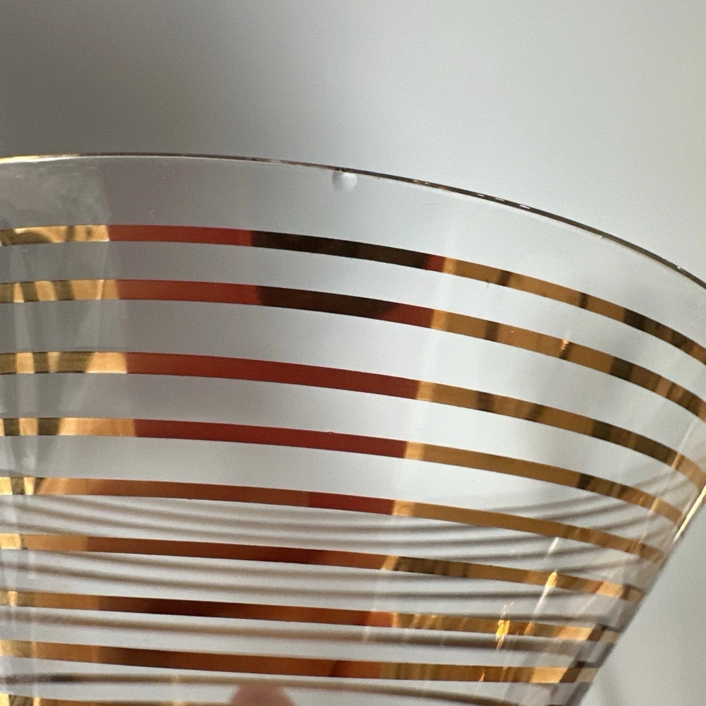 Krosno Martini Cocktail Glasses Gold Stripe Bands Lot of 6 Blown Glass Made in Poland. Note: One Glass Has Small Flea Bite on Rim, See Photos For Details. All Other Glasses Are In Mint Condition. 16-1234-12-4/25’