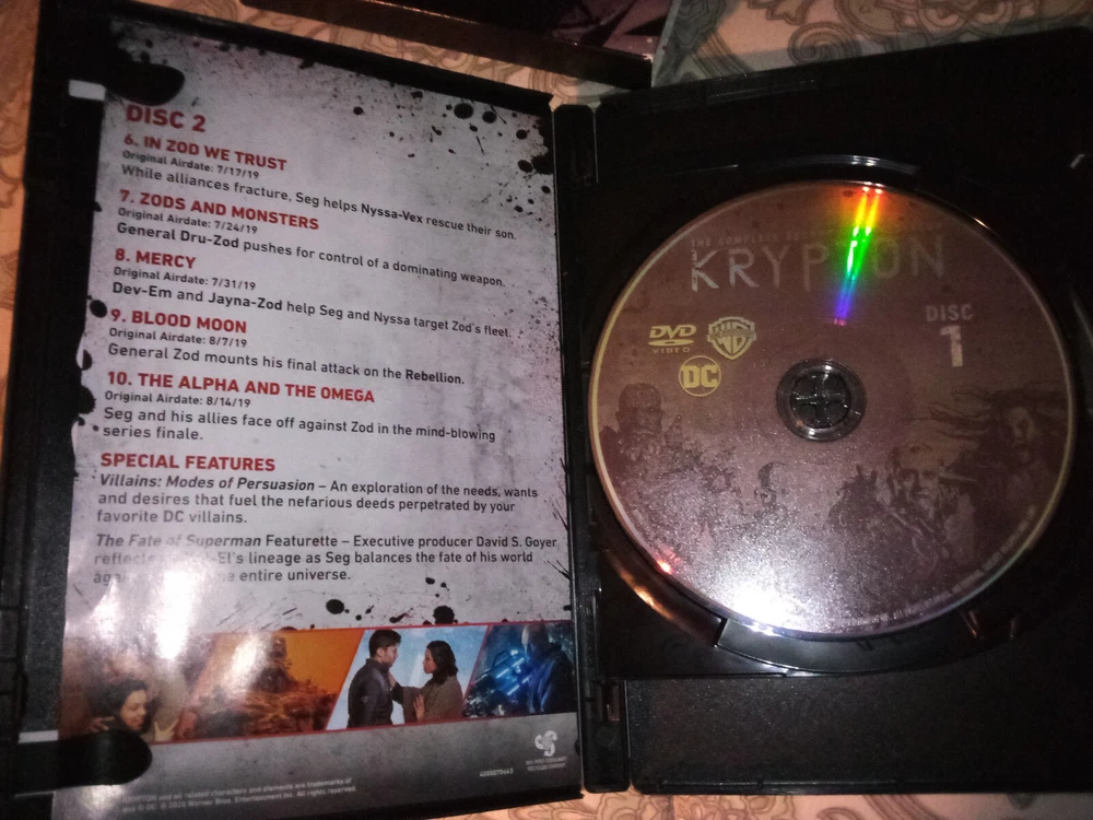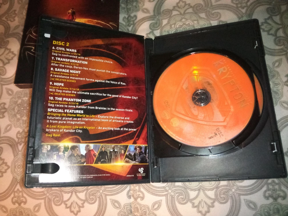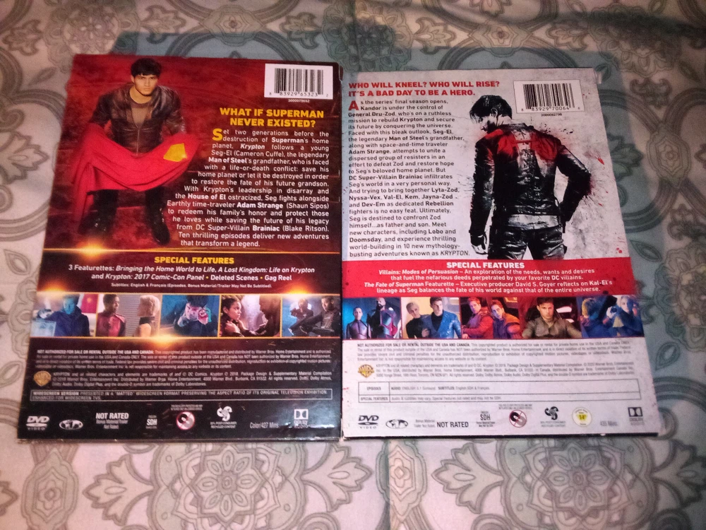 Region Code:DVD: 1 (US, Canada...)Sub-Genre:Aliensgtin13:Does not applyEdition:Box SetMovie/TV Title:KryptonSeason:1, 2Rating:NRGenre:Action, AdventureFeatures:WidescreenAspect Ratio:16:9Cinematic Movement:CultCountry/Region of Manufacture:UnknownFranchise:DCType:TV SeriesStudio:Warner Home VideoRelease Year:2019Run Time:862 MinutesLanguage:EnglishFormat:DVDCase Type:Tall/DVD CaseDirector:VariousUPC:Does not applyActor:Cameron CuffeSubtitle Language:English, FrenchSeller Notes:“See Photos - I recently viewed every episode in both seasons - all played without issue”Video Format:NTSC