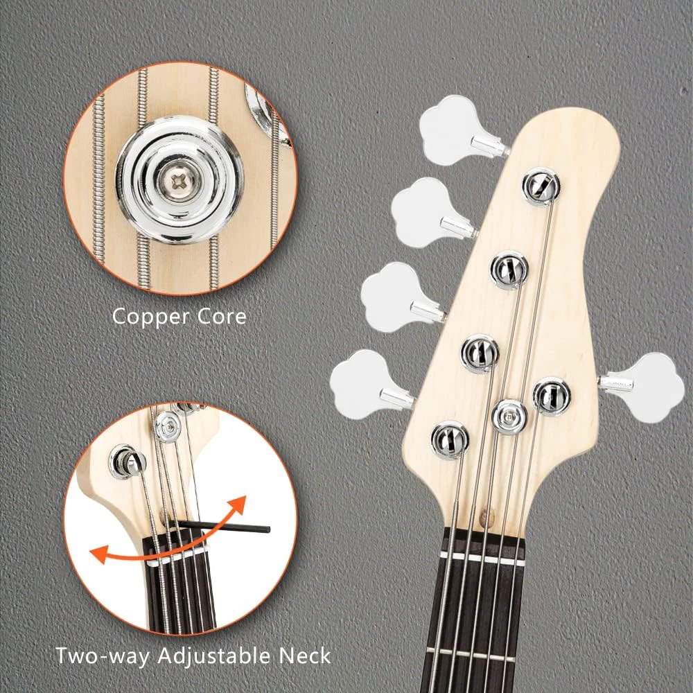 Stylish and Practical Design: The electric guitar's modern C-shaped contour design provides a comfortable feel for a variety of playing music styles. It also offers a classic tone and the single pickup produces a powerful bass sound With Rosewood Fingerboard: This bass features a rosewood fretboard for a brighter, sweeter sound and outstanding high-frequency finish. What's more, it is more suitable for music styles like POP, Jazz, rock, etc First Choice for Gifts: If your friends or family like modern music and this bass is a perfect choice. It's perfect whether it's for family gatherings, school talent shows, or for beginners to learn With Slotted Spindle Knob: The Ktaxon electric bass guitar features vintage-style flat-top knurled headstock knobs that provide smooth, accurate tuning Purchase with Confidence: It contains a bass, guitar bag, strap, a plectrum and wrench tool. We are committed to providing customers with a good shopping experience. If you have any questions or suggestions, please contact us and we will be happy to serve you Ktaxon Electric Bass Guitar, 5 String Full-Size Bass Guitars Beginner Kit 1. Style: Bass Guitar 2. Body Orientation: Right Handed Body: Paulownia 3. Neck and Fingerboard Neck: Maple Fingerboard: Rosewood Strings: 5 Frets: 20 Nut width: 1.772 in. Scale Length: 34" Pickups: Single-Coil Pickup; Single-Coil Pickup Control: Two Volume Controls; One Tone Control Hardware: Fixed(Chrome) Jack: 1/4" 5. Dimensions Guitar: 45.7"H x 13.58"L x 1.65"W Gutiar Weight: 7.38 lb 1 x Bass 1 x Bass Bag 1 x Guitar Strap 1 x Amp Wire 1 x Wrench Tool 1 x Plectrum