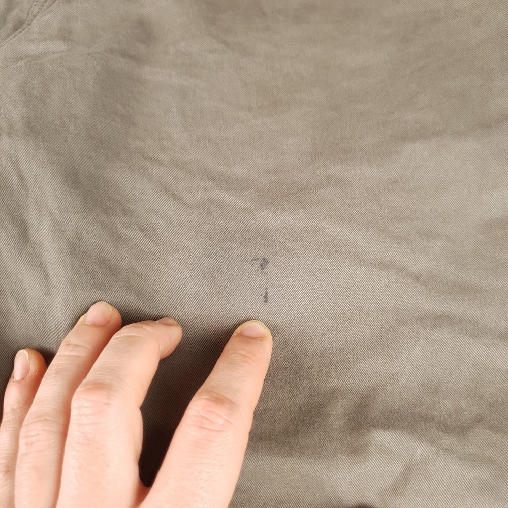 Has stains shown in photo 3 and 4. Tagged size 36x32 see photos for measurements to determine proper fit before buying. Thanks. Olive greenish gray color.