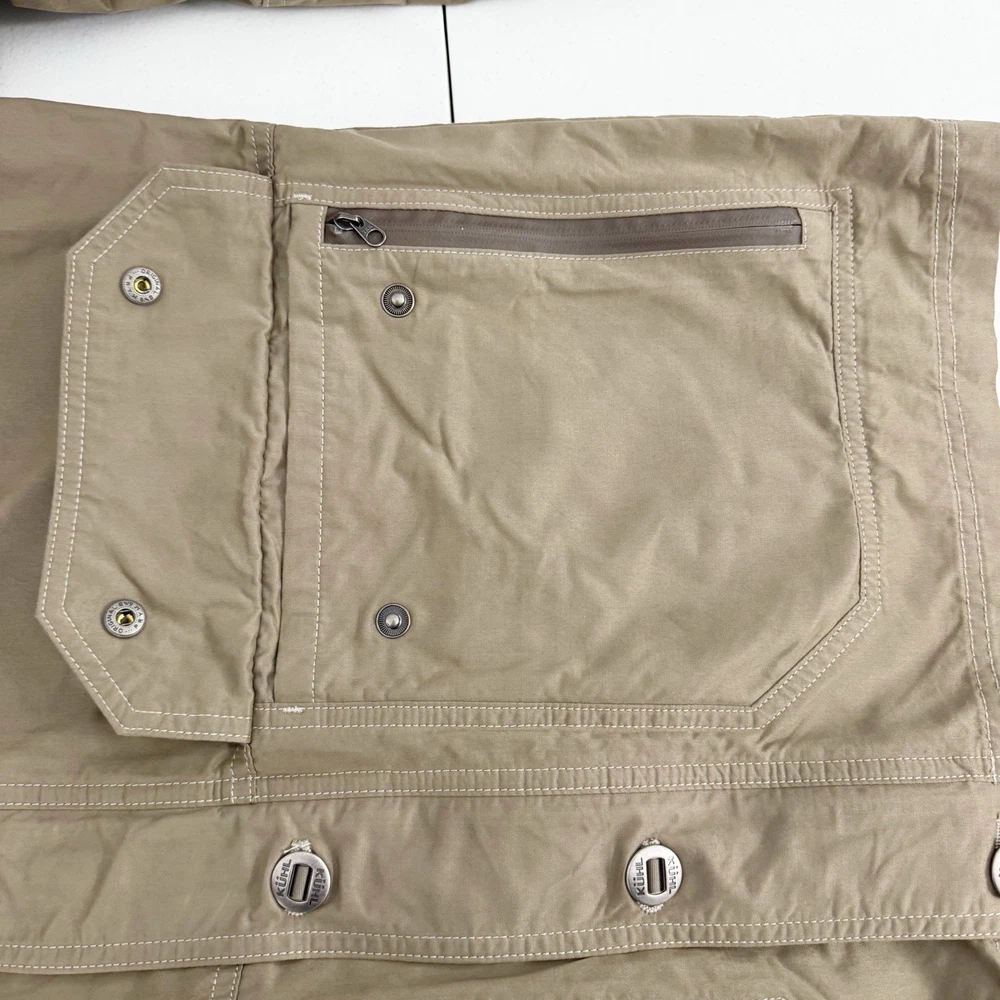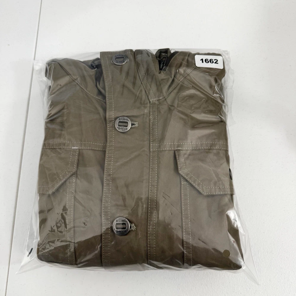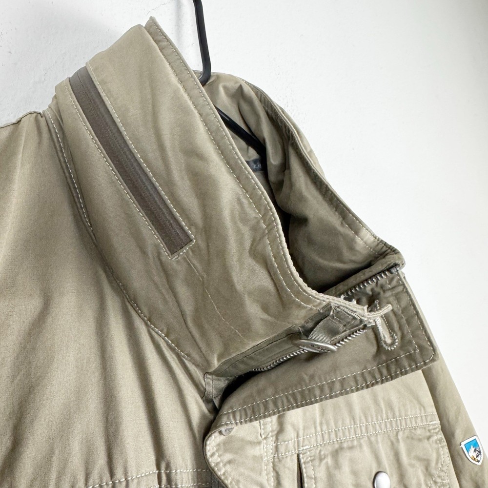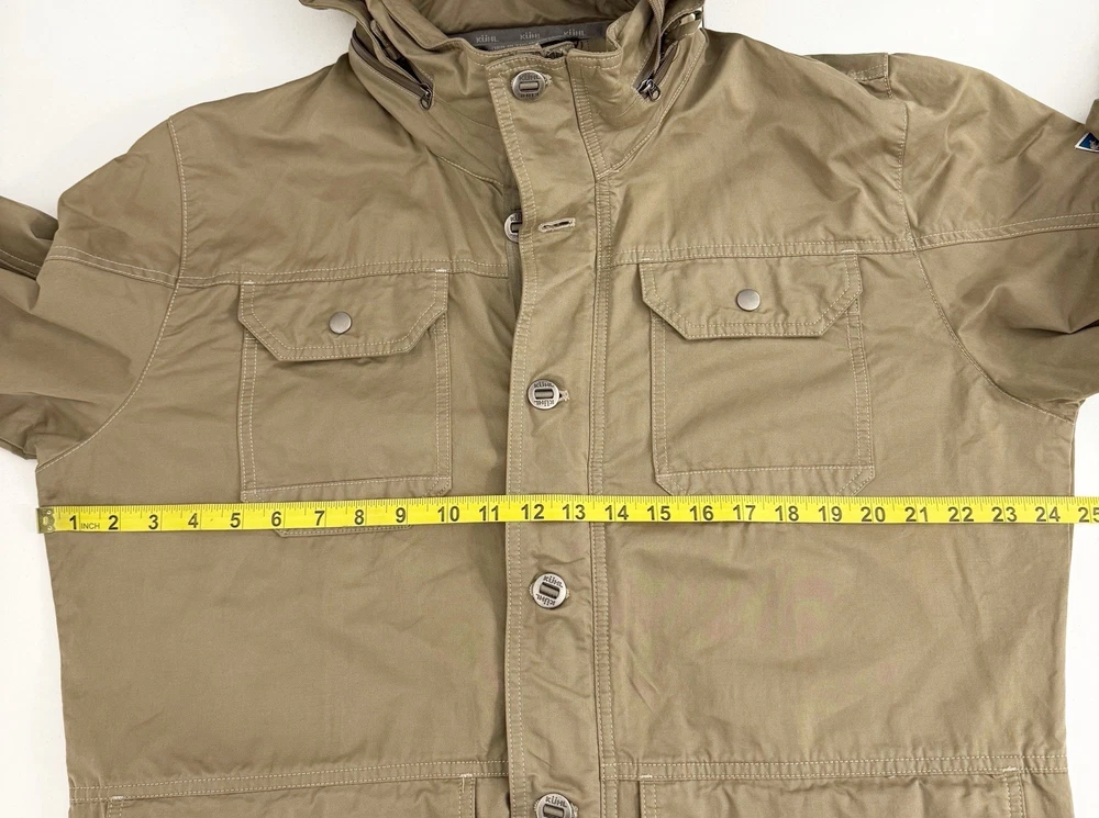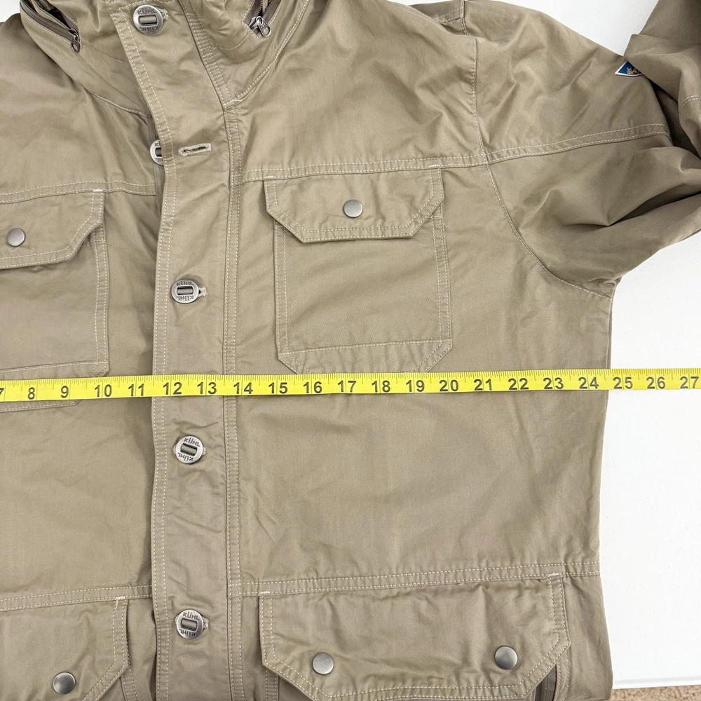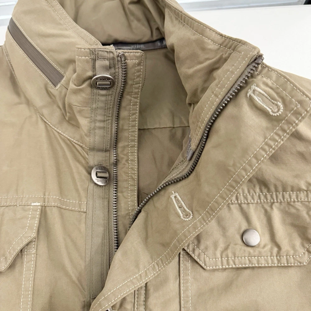 Size: L Size Type: Regular Garment Care: Machine Washable Type: Jacket Jacket/Coat Length: Mid-Length MPN: 1040 Accents: Logo Country of Origin: China Features: Pockets, Water Resistant, Wind-Resistant, Zipped Pockets, Packable Hood Department: Men Color: Beige Closure: Button, Zip Brand: Kuhl Season: Fall, Spring, Winter Outer Shell Material: Cotton Blend Fit: Regular Style: Utility Jacket Pattern: Solid Theme: Outdoor Occasion: Casual