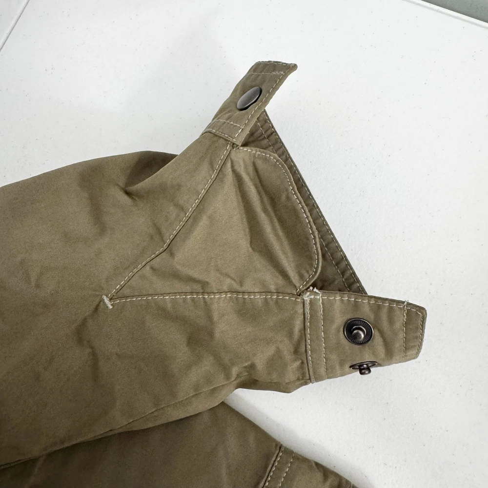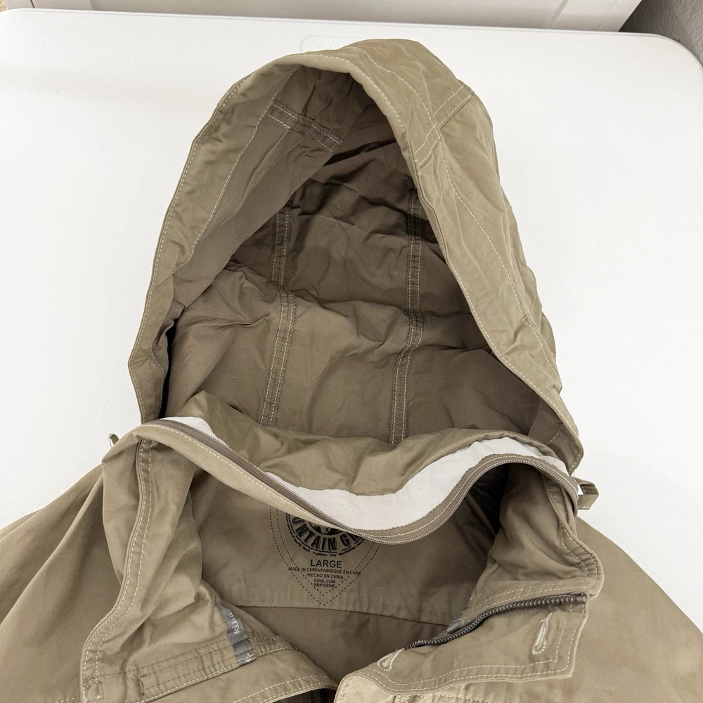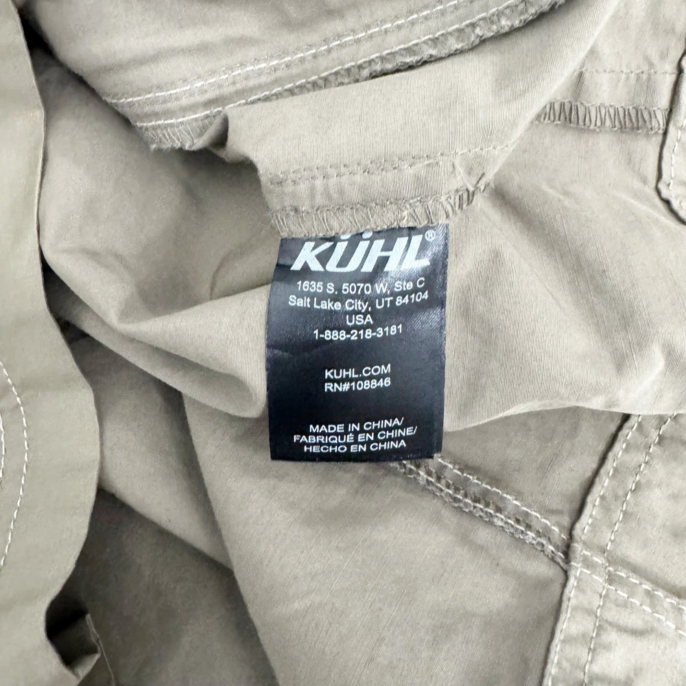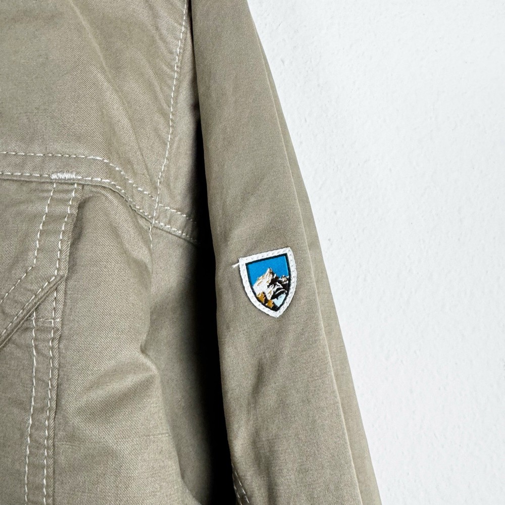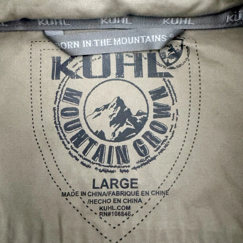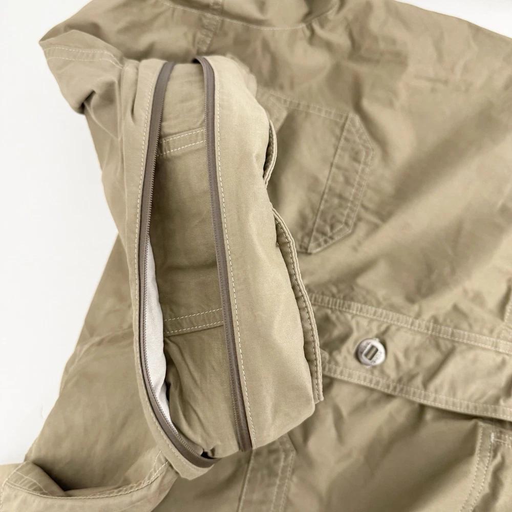 Size: L Size Type: Regular Garment Care: Machine Washable Type: Jacket Jacket/Coat Length: Mid-Length MPN: 1040 Accents: Logo Country of Origin: China Features: Pockets, Water Resistant, Wind-Resistant, Zipped Pockets, Packable Hood Department: Men Color: Beige Closure: Button, Zip Brand: Kuhl Season: Fall, Spring, Winter Outer Shell Material: Cotton Blend Fit: Regular Style: Utility Jacket Pattern: Solid Theme: Outdoor Occasion: Casual