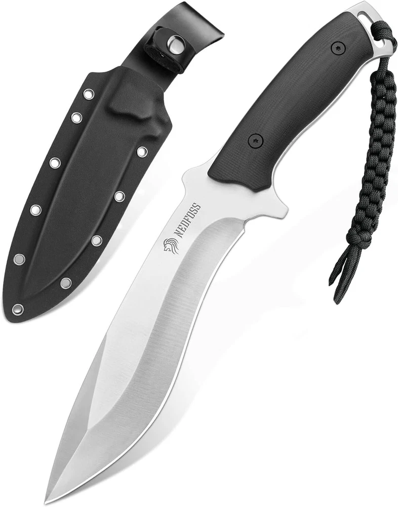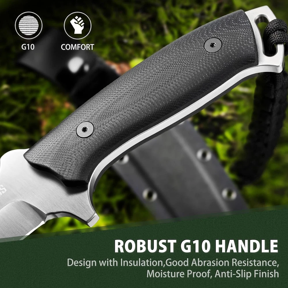Kukri Survival Knife with Sheath, 6" Full Tang Fixed Blade Hunting Knife with G10 Handle for Outdoor, Camping and Survival, Camping Gifts for Men ✅ 【100% PREMIUM MATERIAL】 The hunting blade is made of the best AUS-8 steel and is made from the tip to the end of the handle from a single, " long piece. This machete creates a truly exclusive piece that shouldn't be missing in any camping knife collection! ✅ 【COMFORTABLE GRIP & BALANCE】 Ergonomic handle made of black G10, easy to hold, has a good balance between blade and handle, This full tang survival knife has confidence that the blade will not slip with the security of the hand guard ✅ 【DIMENSIONS】 inches overall length with a blade length of inches, blade thickness of " and a weight of ✅ 【PERMANENT CARRY】 Features a unique design with hunting knife sheath that combines the durability of vegetable-tanned leather belt loop and the robustness of kydex sheath. Belt loop and buckle ensure secure retention of the bushcraft knife in the kydex sheath, providing comfort and safety for carrying in any situation. ✅【PERFECT FOR OUTDOOR & COLLECTION】 A smooth elegant design combined with sturdy functionality. Suitable for hunting, survival, fishing and other outdoor situations. Ideal gift for men women, hunter, fisherman, camping lover.