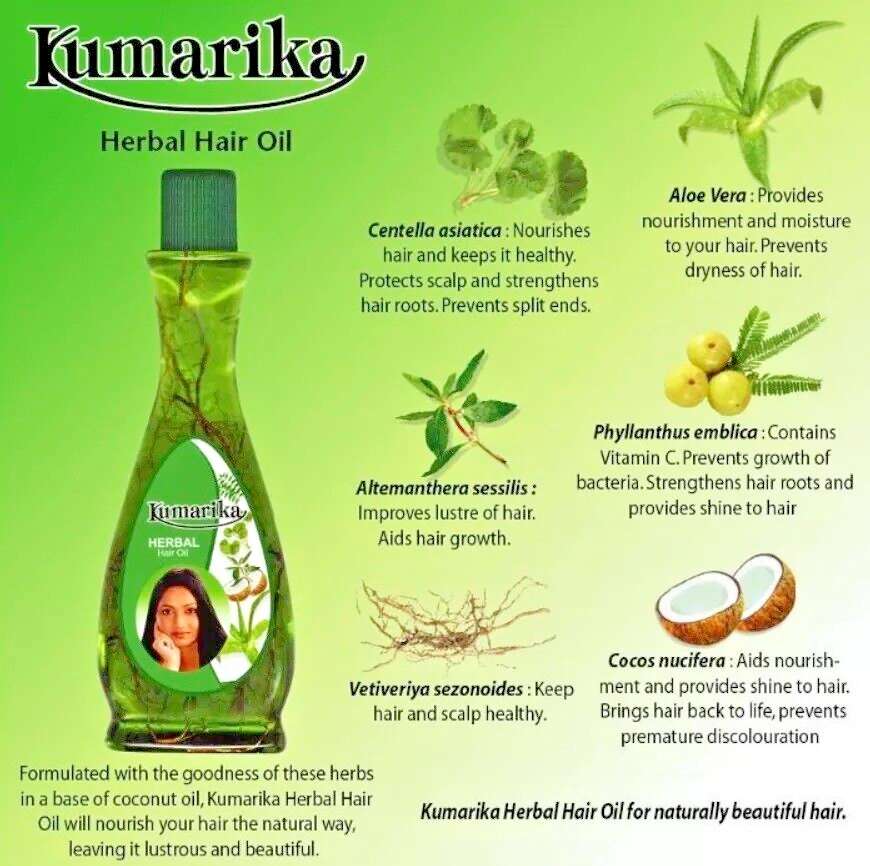 Kumarika Hair Oil Hair Fall Control Nourishing Ayurvedic Natural Oil – 100ml&200ml bottles Revitalize your hair with Kumarika Hair Oil , an Ayurvedic solution designed to control hair fall and nourish your scalp. This natural oil blend is enriched with a powerful combination of herbs like Amla, Brahmi, Coconut Oil, and more, to strengthen hair roots, reduce hair fall, and promote healthier hair growth. Perfect for all hair types, this lightweight oil deeply moisturizes, combats dandruff, and improves the overall health of your hair. Key Benefits: Helps reduce hair fall and promotes stronger hair. Enriched with Ayurvedic herbs and natural oils. Moisturizes the scalp and enhances hair health. Helps reduce dandruff and supports healthy hair growth. Ideal for all hair types. Ingredients: Coconut Oil : Nourishes and strengthens hair from the roots. Amla (Indian Gooseberry) : Rich in Vitamin C, helps prevent hair thinning and encourages growth. Brahmi : Stimulates the scalp and strengthens hair follicles. Neem : Keeps the scalp healthy, preventing dandruff and infections. Fenugreek & Henna : Conditions the hair, making it soft, shiny, and smooth. Volume Options: Available in 100ml &200mlbottles. Directions: Massage a generous amount of oil onto your scalp and hair. Leave it on for a few hours or overnight for best results. Wash with a mild shampoo. Made in sri lanka