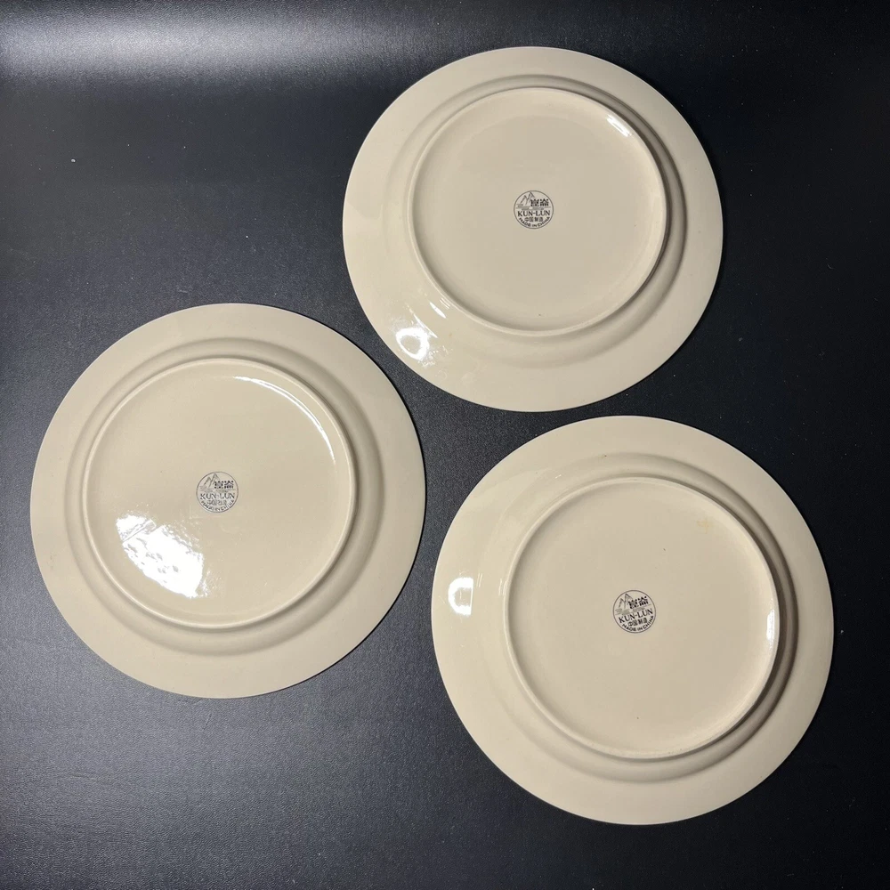 Kun Lun Stoneware Maroon and Brown Print 7" Dessert or Salad Plates Lot of 3 Deep red/maroon and tan/brown design on cream color ceramic plate. No chips or cracks.