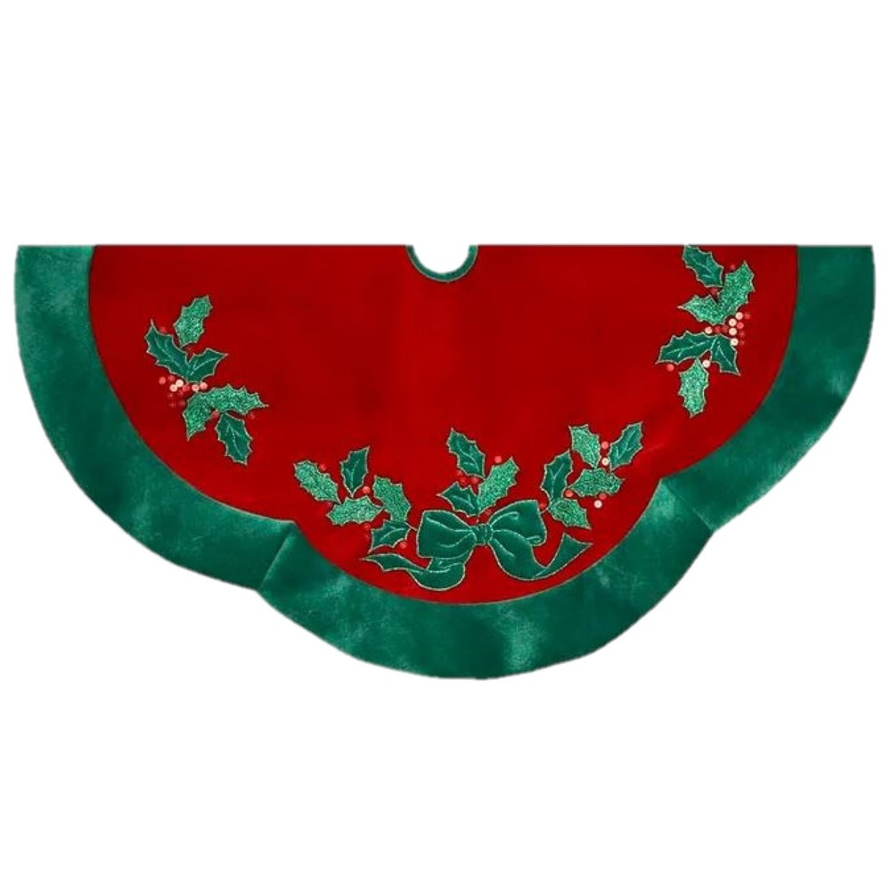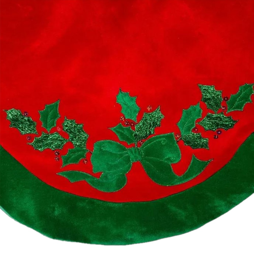 Kurt Adler Velvet Christmas Tree Skirt, Red and Green, 48in PRODUCT DESCRIPTION A beautifully detailed Christmas tree skirt for your home! Key Product Features Made of polyester Velvet red and green for a festive look Beautiful green holly leaves applique Classic round design with scalloped edge Measures 48 inches in diameter This Kurt Adler velvet red with green leaves applique tree skirt is a fun, festive way to add to the décor of your Christmas tree. Its bright red color is trimmed in bold green, the same color as the bow and holly leaf applique detailing. Green holly and bow appliques accented with red sequins berries.