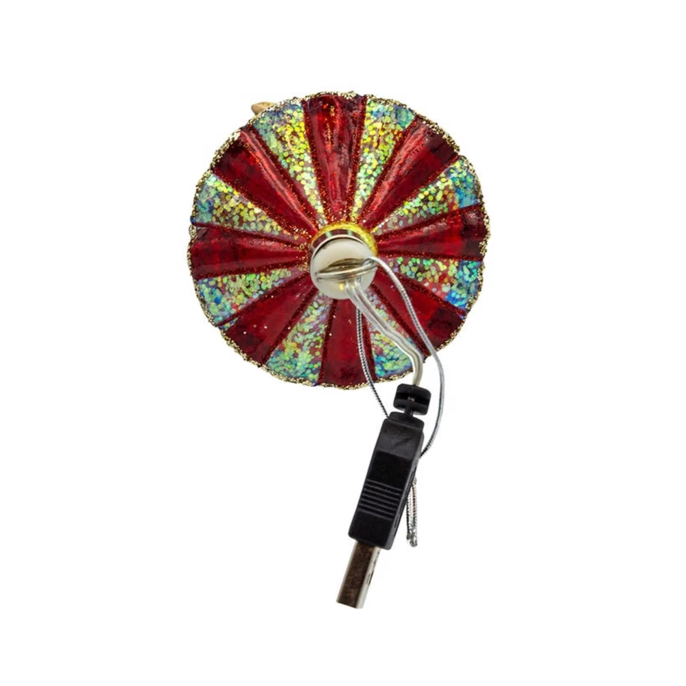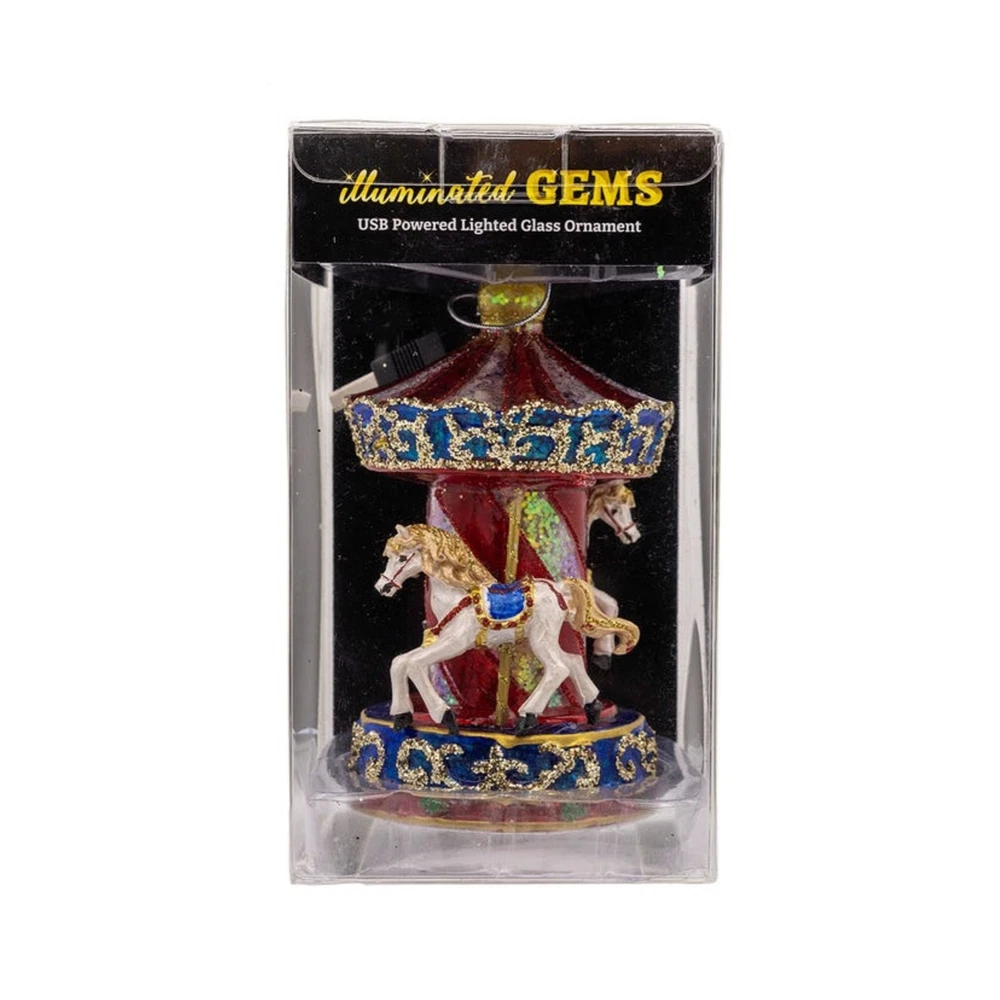 Kurt Adler Pre-lit Glass Ornament, Warm White LED's, Carousel PRODUCT DESCRIPTION This nostalgic carousel ornament from Kurt Adler is sure to evoke some warmth and wonder amongst your beautiful holiday display! Key Product Features Powered by USB Materials: Glass 78%, Paint/Mica 10%, Metal 5%, Plastic 5%, Copper 2% Contains 7 steady on warm white LED fairy lights Features an 18" lead wire Intended for indoor use only Kurt Adler's Glass USB Warm White LED Fairy Light Carousel Ornament is a whimsical and enchanting decorative piece that adds a touch of magic and nostalgia to your holiday decor. This delightful ornament features a beautifully detailed carousel adorned with warm white LED fairy lights, creating a warm and inviting atmosphere. This ornament is USB-powered, allowing you to easily connect it to a USB port, adapter, or power bank for convenient and energy-efficient operation. Use it as a standalone decoration, hang it on your Christmas tree, place it on a mantel or tabletop, or include it in your holiday centerpiece.