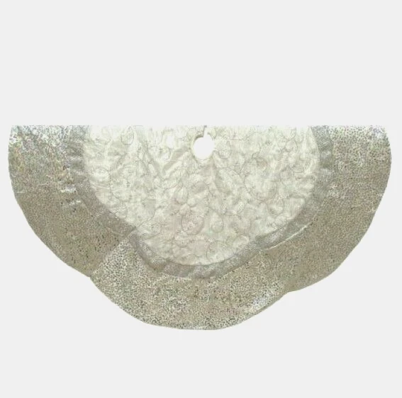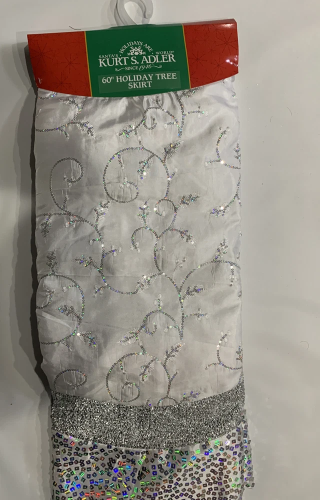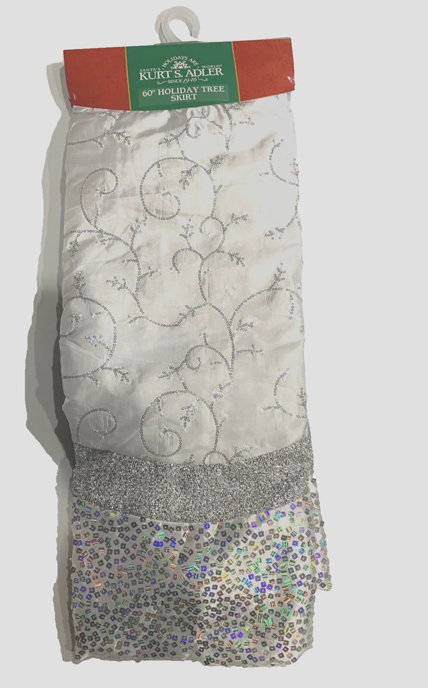 Kurt Adler Holiday Tree Skirt color: Silver size: 60" This Treeskirt from Kurt Adler is a festive way to add to the décor of your Christmas tree. Its large 60" design has a scalloped edge and features silver sequins and embroidery for an extra festive touch, and the size is perfect for larger trees or for adding drama to any tree size 60" x 60" x 0.3" polyester retail $250