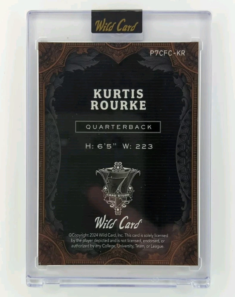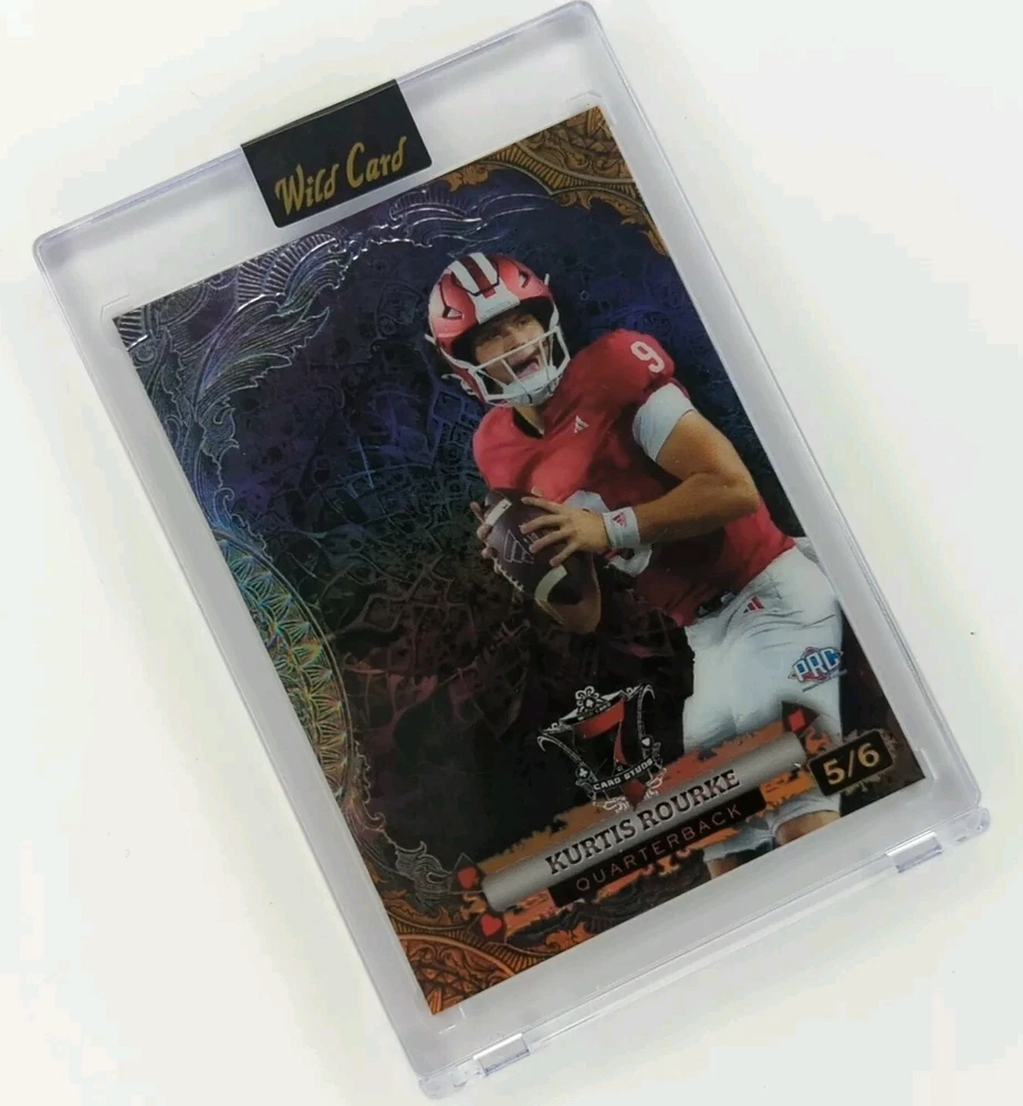 The Kurtis Rourke 5/6 - 2024 Wild Card 7 Card Studs Metal Edition trading card features a metal material and is serial numbered out of 6. This rookie card is from the National Football League (NFL) season, showcasing Kurtis Rourke from the Indiana Hoosiers team. The card is encased and includes parallel/variety elements, making it a valuable addition to any football card collection.
