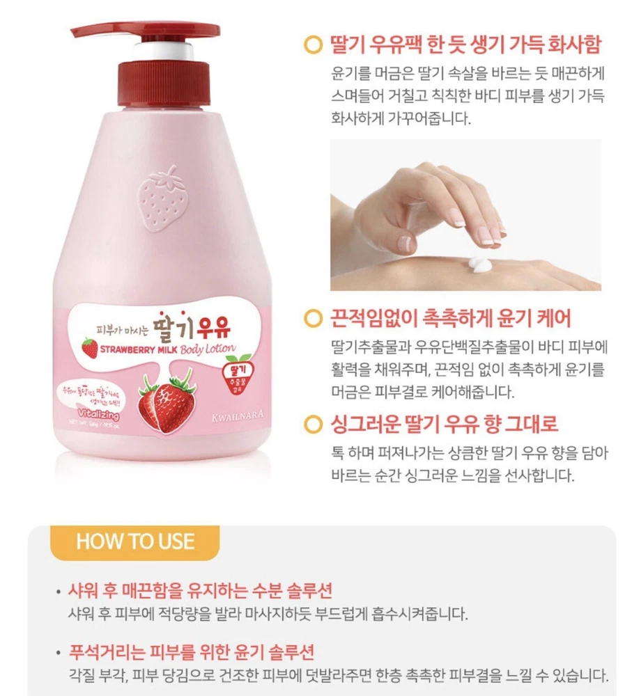 Country/Region of Manufacture: Korea, Republic of Skin Type: All Skin Types Department: Women Main Purpose: Moisturizer Set Includes: Daily Use Formulation: Lotion, Gel Body Area: Arm, Feet, Full Body, Hand, Leg, Neck Product Line: Kwailnara Strawberry Milk Color: Pink Volume: 18.9 fl oz Type: Daily Use Brand: Kwailnara Scent: Strawberry Size: Regular Features: Hydrating Ingredients: Milk