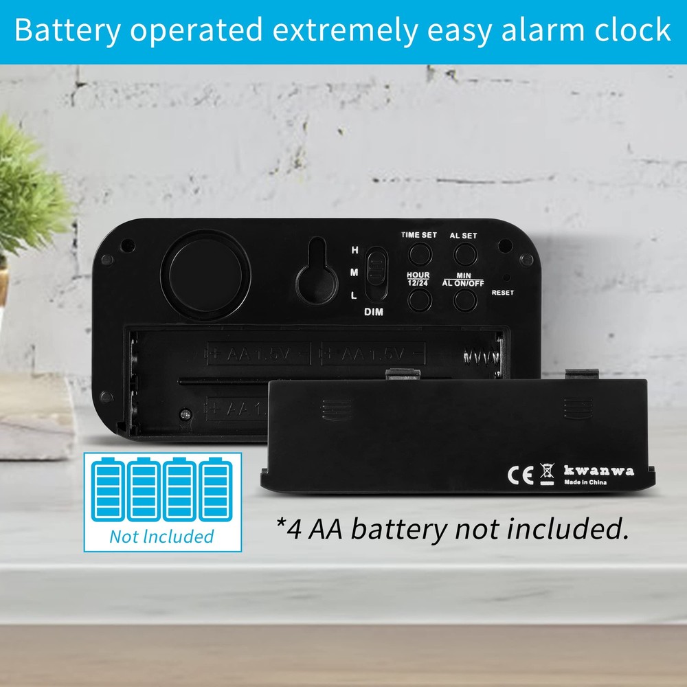 Introducing the Alarm Clock, a sleek and functional timepiece designed for modern spaces. This unisex clock features a 5.1 inches wide and 2.6 inches tall rectangular frame in a sophisticated black finish, perfectly complementing any indoor setting, especially bedrooms. The clock boasts a large, easy-to-read 1.2'' LED blue digit display, ensuring clear visibility even in dimly lit environments. Powered by 4 AA batteries (not included), this clock offers over a year of constant use, with an auto-dimming feature that activates from 8 PM to 6 AM to preserve battery life and ensure a peaceful sleep environment. The Alarm Clock is equipped with an intuitive alarm function that includes a 90-second beep, increasing in volume every 30 seconds, and a 7-minute snooze that can be repeated up to three times. The clock also offers three levels of brightness for daytime use and a convenient snooze button for those extra minutes of sleep. With its versatile tabletop or wall-mount design, this clock is an ideal addition to any room, making it a perfect gift for any occasion. Alarm clock & battery operated clock - This basic clock is powered by 4 x AA alkaline batteries only (not included), which can keep Constantly Big 1.2'' LED digit time display for more than 12 months. Bright LED time display, 24hour light up 1.2" large led time numbers can let you check your time clearly from a distance or even in the dark. It is a simple clock. Easy to set - Intuitive and Clear Marked Button, Great alarm clocks for kids and the elderly, they can operate the clock, set time, alarm, dimmer and 12Hr/ 24Hr. When the alarm is beeping, simply touch the top big snooze to pause the alarm to get extra 7 minutes nap, press any button to stop alarm today, and it will still sound the next day. Press “AL ON/OFF” to cancel the alarms and the alarm icon on the top-right corner will disappear. Alarm clock for bedroom - There are 3 levels of brightness for your options (day time), high/middle/low. The clock will enter into Night-mode and dim automatically at 8:00pm~6:00am to protect your eyes at night and save energy. No blinding lights or any annoying sounds disturb your sleep, create an peaceful environment for sleep. Perfect alarm clock for bedroom, beside, nightstand, desk, shelf and table. Digital alarm clock - Alarm clock will continue for 90 seconds ensuring definitely waking up. The alarm bell will louder every 30 seconds. There is also a 7-minute snooze that can be continually pressed repeat 3 times. The time accuracy of this clock is less than +/-30s per month. Small wall clock & desk clock - 1 holes on the back for easy wall-mounting for a small wall clock. It is also table-top for a simple desk clock. Perfect gifts for kids, toddlers, teens, adult, seniors, elderly, boys or girls, friends or families, ideal for gifts alarm clock.
