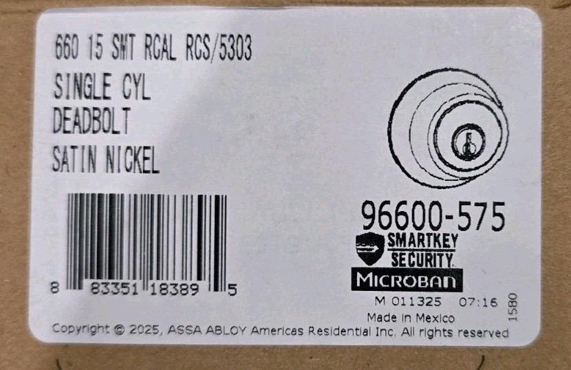 Material: Nickel Type: Deadbolt Items Included: Hardware, Key, Instructions Suitable For: Front Door Door Handing: Universal/Reversible eBay Product ID (ePID): 710168195 Brand: Kwikset Fixings Supplied: No Finish: Satin Number in Pack: 1 Features: Electronic Model: Kwikset 660 15 SMT Mounting: Side Mount MPN: 96600-575
