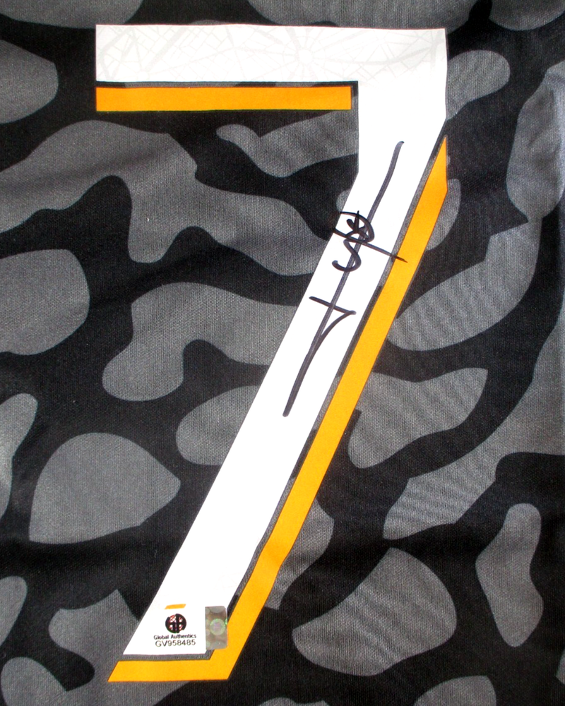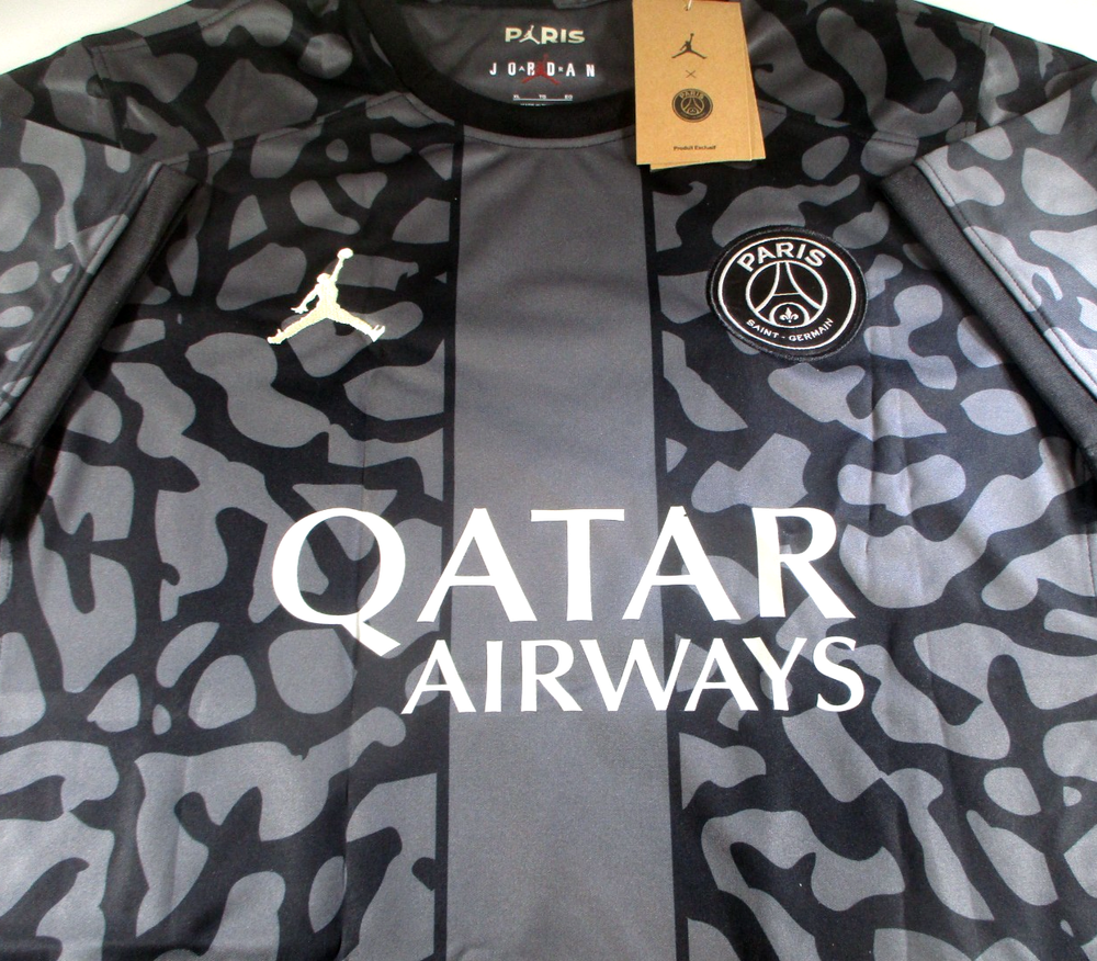 This sale is for a new condition Paris Saint-Germain Jordan Brand Dri-Fit pro-style soccer jersey in size extra-large, featuring the Jordan, Paris Saint-Germain as well as size and sponsorship tags and/or logos affixed or heat pressed to the uniform. This is a grey and black jersey with white and orange characters and stripes. The jersey has been hand signed by and Team France and former Paris Saint-Germain Superstar Forward Kylian Mbappe in black sharpie across the number on the back of this item. This item has been authenticated by Global Authentics as shown in the listing photos. Thank you for your interest in this item.