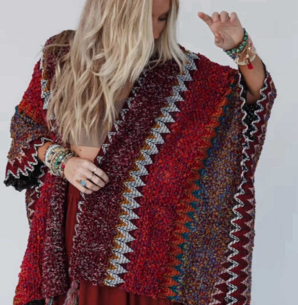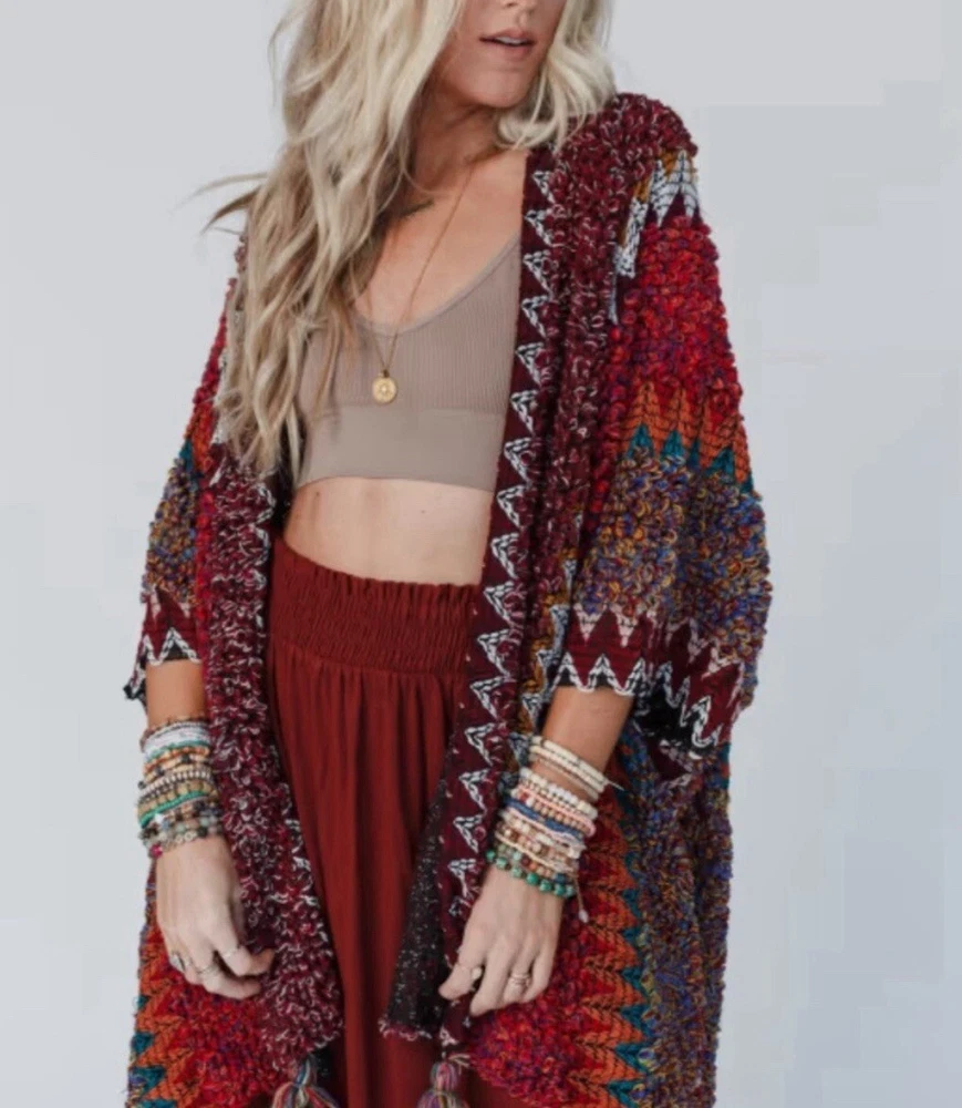 Darling Bohemian Loom Knit Shall Cardigan with the sweetest tasseled hem. + Bright Knitted Yarn + Open Draped Front + Armholes + Sweet Tasseled Hem + Acrylic Yarn + One Size Fits All + Heather the model is 5'8" / 140 lbs + Unlined Ships fast from our studio in Washington State! Approx. Measurements: 38 inches in Length 35 inches pit to pit Combined Shipping Discount: Check out my other sweaters up for auction at up to 80% off retail! Each additional item purchased the same day ships for $1.00 each! Check out our other auctions: Check out my eBay Store! ** Bid With Confidence ** 21 Years on eBay with a Top Rated Status **